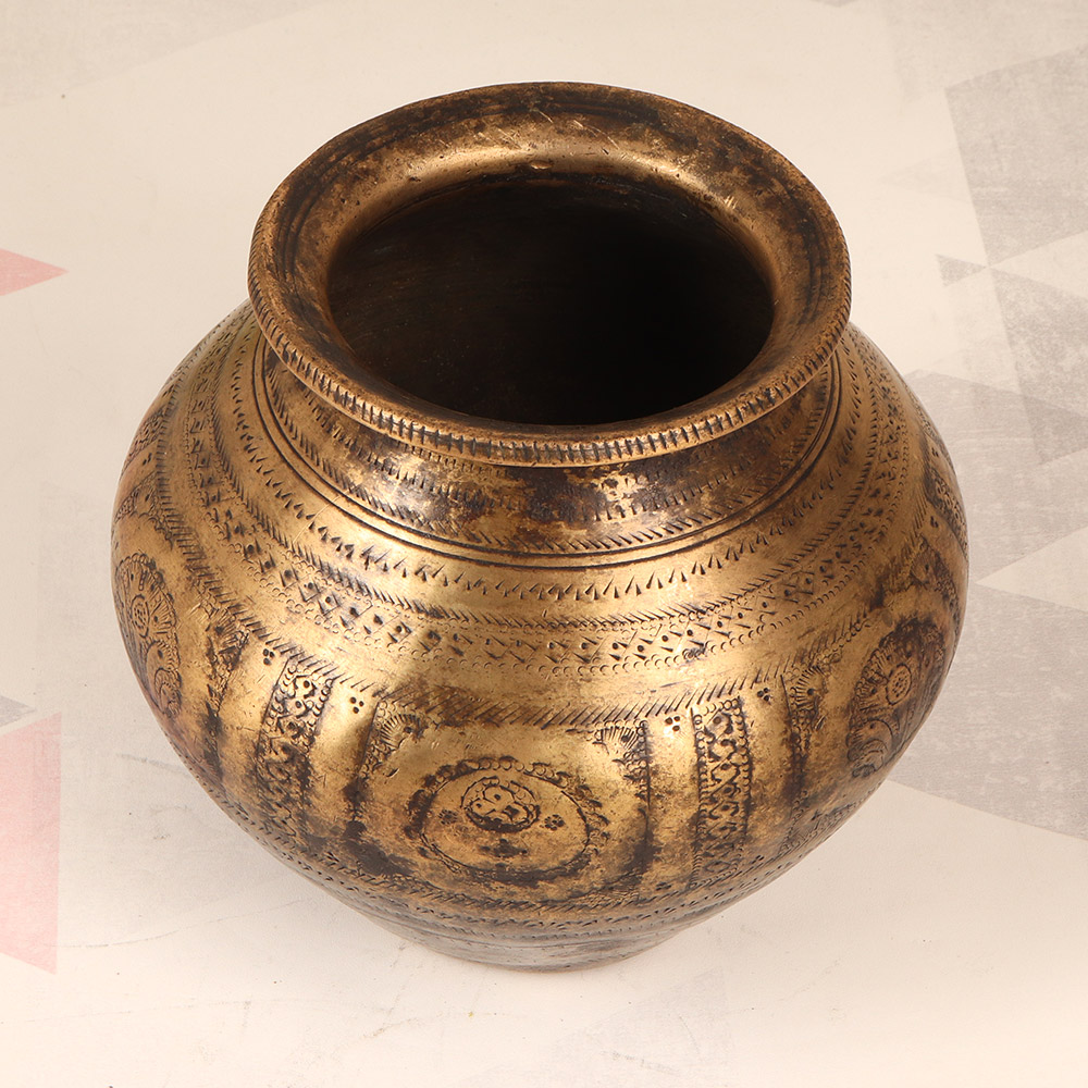 This stunning vintage brass holy water pot is a true work of art, blending centuries-old craftsmanship with the captivating designs of South Indian tradition. Meticulously engraved by skilled artisans, the exterior features intricate patterns and motifs that celebrate the rich cultural heritage of the region. Whether you're looking to enhance your personal meditation practice, create a serene sacred space, or add an elegant touch to your home decor, this holy water pot is an invaluable addition. Its sturdy brass construction ensures durability that will withstand the test of time, while the classic silhouette complements a variety of interior styles. This holy water pot is a must-have for anyone seeking to deepen their spiritual journey or infuse their living space with a sense of timeless beauty and divine energy. Use it to hold blessed water for rituals, bless yourself and your loved ones, or simply let it serve as a stunning centerpiece that radiates peace and positivity throughout your home.