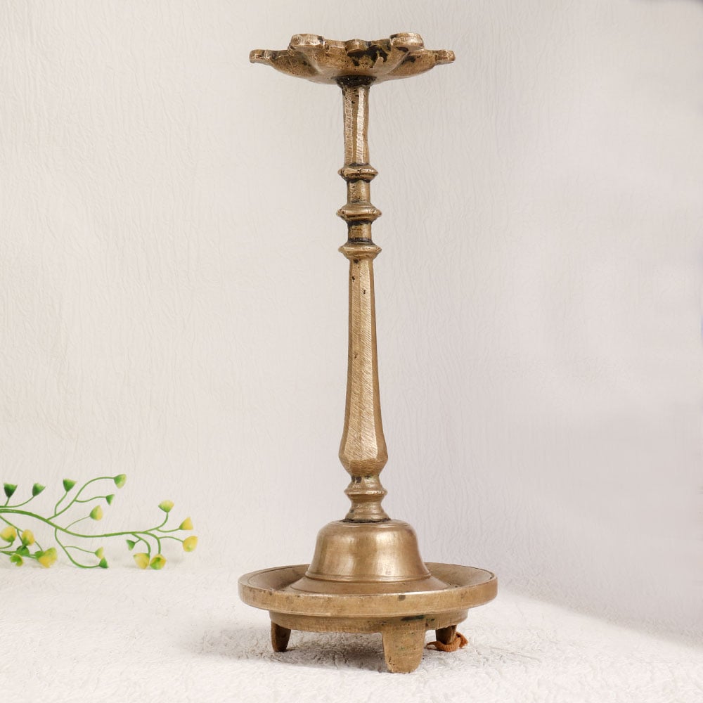 This Vintage Brass Oil Lamp is a timeless masterpiece that embodies the rich heritage of South Indian craftsmanship. Handcrafted with precision and care by skilled Indian artisans, this exquisite lamp showcases the intricate details of South Indian Art. Crafted from high-quality brass, this lamp boasts an antique brown finish that exudes warmth and character. Featuring six jyots, it can be lit simultaneously using traditional fuels like mustard oil or desi ghee, paired with cotton wicks. This versatile lamp serves as a captivating addition to any setting, be it at home, in the office, a restaurant, hotel, cafe, or shop. Its soft, ambient glow not only elevates the atmosphere but also adds a touch of old-world charm. Perfect for enhancing the spirituality of your prayer room or temple, this lamp radiates a divine aura during religious rituals. It's also an ideal addition to your vintage collection or exhibition display, showcasing the artistry of a bygone era. Celebrate special, festive, or auspicious occasions by gifting this Vintage Brass Oil Lamp to your loved ones.
