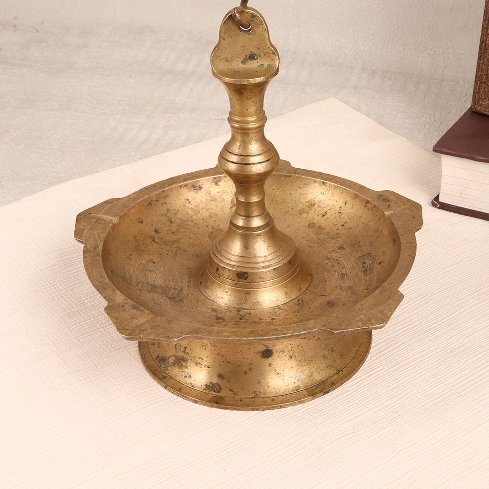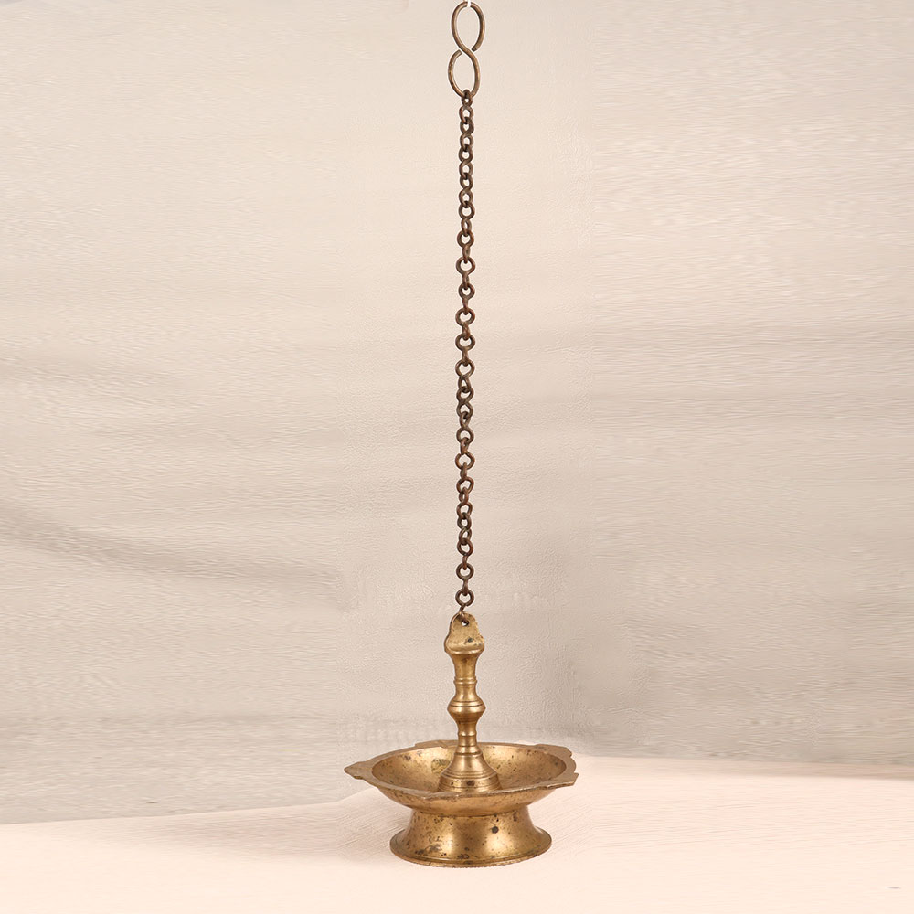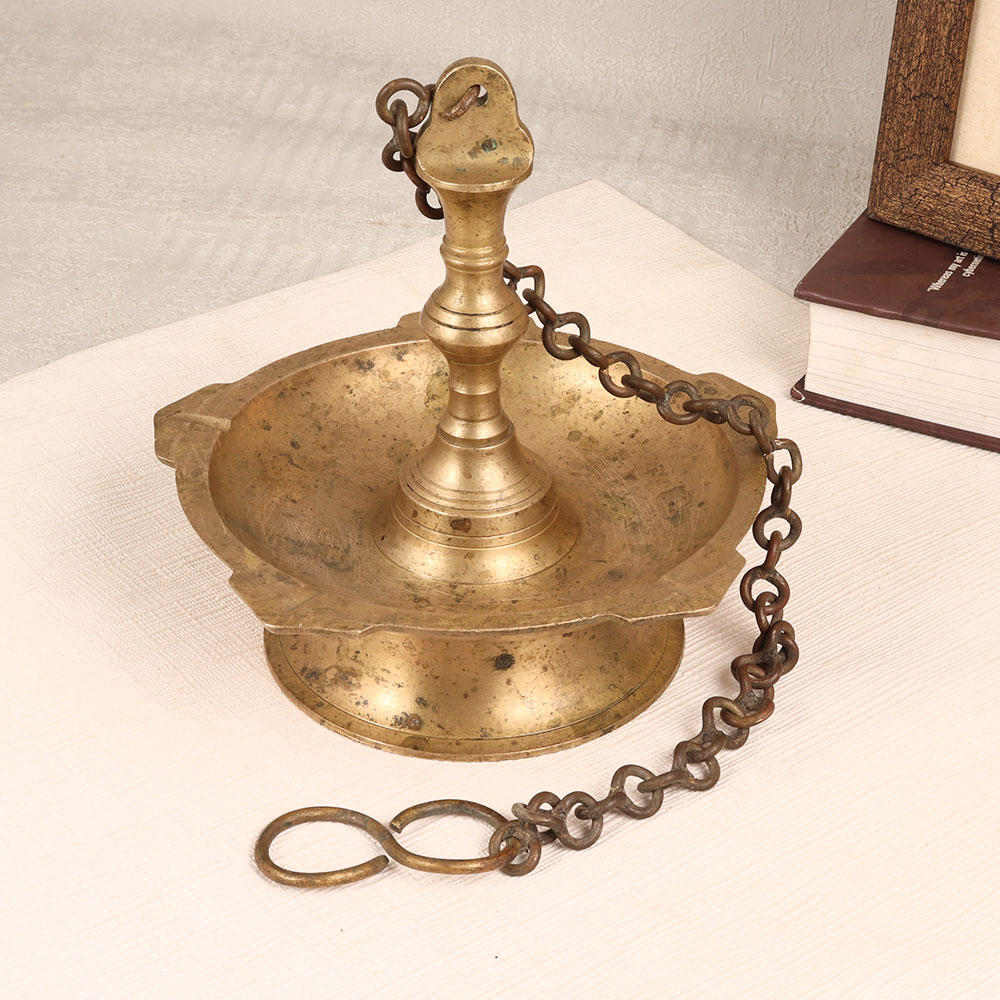 Enhance the ambiance of your space with our exquisite Vintage Brass Hanging Oil Lamp. This timeless piece with an antique brown finish is a symbol of craftsmanship and heritage. Handmade by highly skilled Indian artisans specializing in South Indian Art, this lamp is crafted from high-quality brass, ensuring durability and authenticity. Designed to hold five jyots simultaneously, the lamp allows you to illuminate your surroundings with the warm glow of mustard oil or ghee using cotton wicks. Light it during special occasions, auspicious events, or prayer sessions to create a serene atmosphere that radiates positive vibes. Versatile and elegant, this hanging oil lamp is suitable for various settings, including homes, offices, restaurants, hotels, cafes, and prayer rooms. Enhance your vintage collection or gift this masterpiece to your loved ones on special, festive, or auspicious occasions.