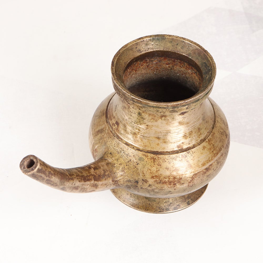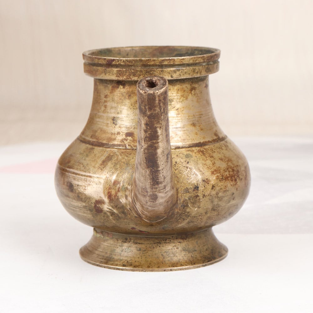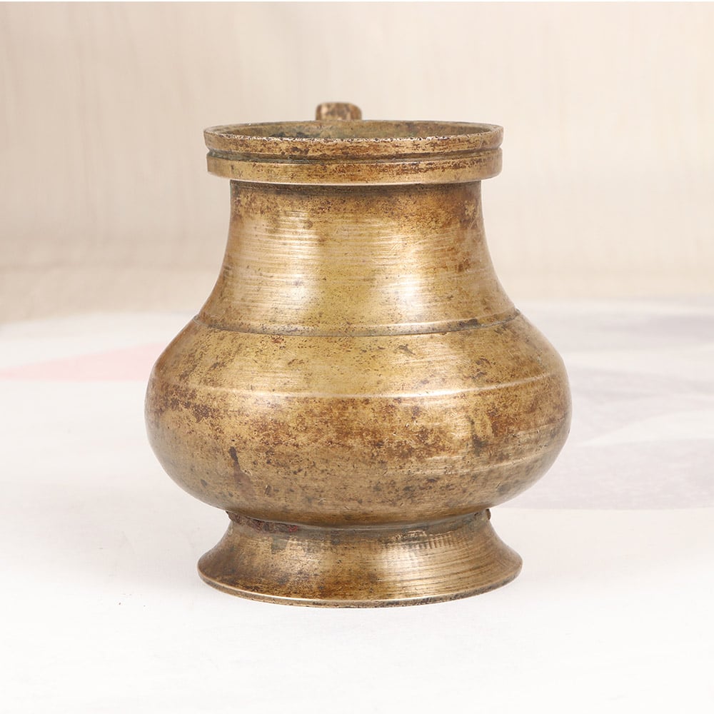 Bring the timeless beauty of South Indian art into your sacred space with this stunning vintage brass holy water pot. Crafted with meticulous attention to detail, this functional yet elegant vessel will transform your prayer and meditation practices. Infuse your daily rituals with deeper meaning and intention using this beautiful brass pot. Fill it with holy water to cleanse and purify your space, or use it to hold offerings during puja. Its simple, understated elegance will imbue your spiritual practice with a sense of timeless reverence. Whether you're an experienced yogi, a devout Hindu, or simply someone seeking to cultivate more mindfulness, this vintage brass pot will quickly become an indispensable tool in your self-care toolkit. Display it proudly as a stunning work of South Indian art, and let it inspire you to slow down, connect with the divine, and honor the sacred in every moment.