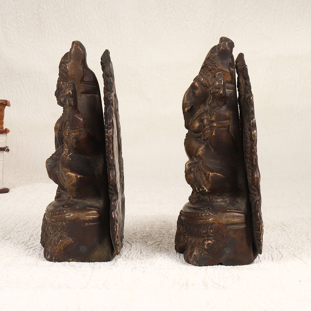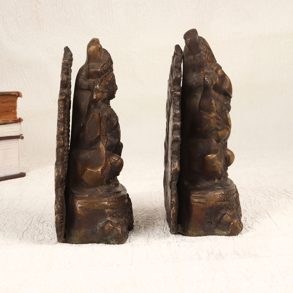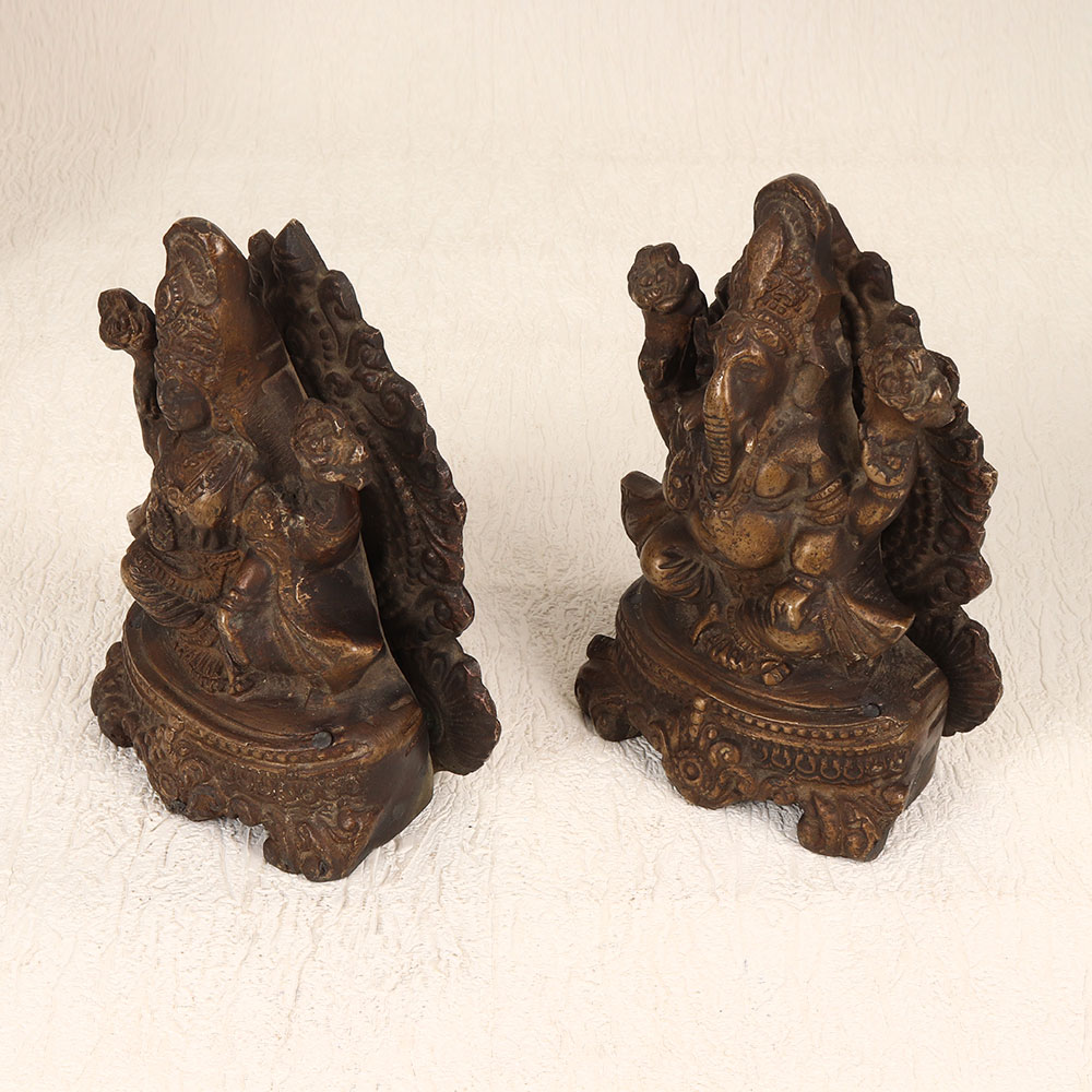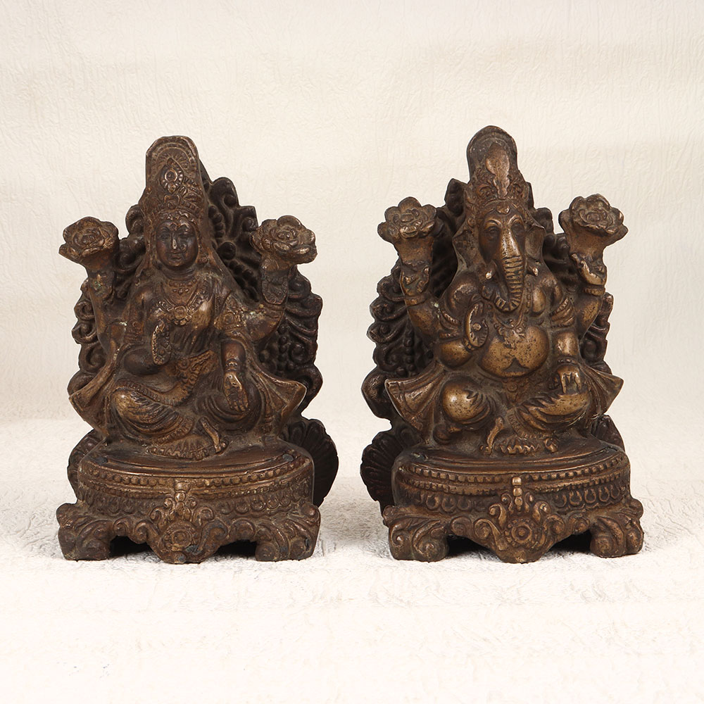 This Vintage Brass Lord Ganesha and Goddess Laxmi statue set is a testament to traditional South Indian artistry. Meticulously handcrafted by professional Indian artisans, these statues showcase a rich antique brown finish, accentuating the intricate details of the divine figures. Crafted from high-quality brass, the pair emanates a warm and regal aura, adding a touch of spirituality to any setting. Perfect for adorning your home, office, restaurant, hotel, or cafe prayer room, these statues serve both as sacred symbols and captivating decorative pieces. Their versatile appeal allows them to seamlessly blend into various environments, creating an ambiance of serenity and cultural richness. Whether enhancing your vintage collection or presenting it as a thoughtful gift on special, festive, or auspicious occasions, this brass masterpiece transcends time, connecting you to the heritage of Indian craftsmanship and spirituality.