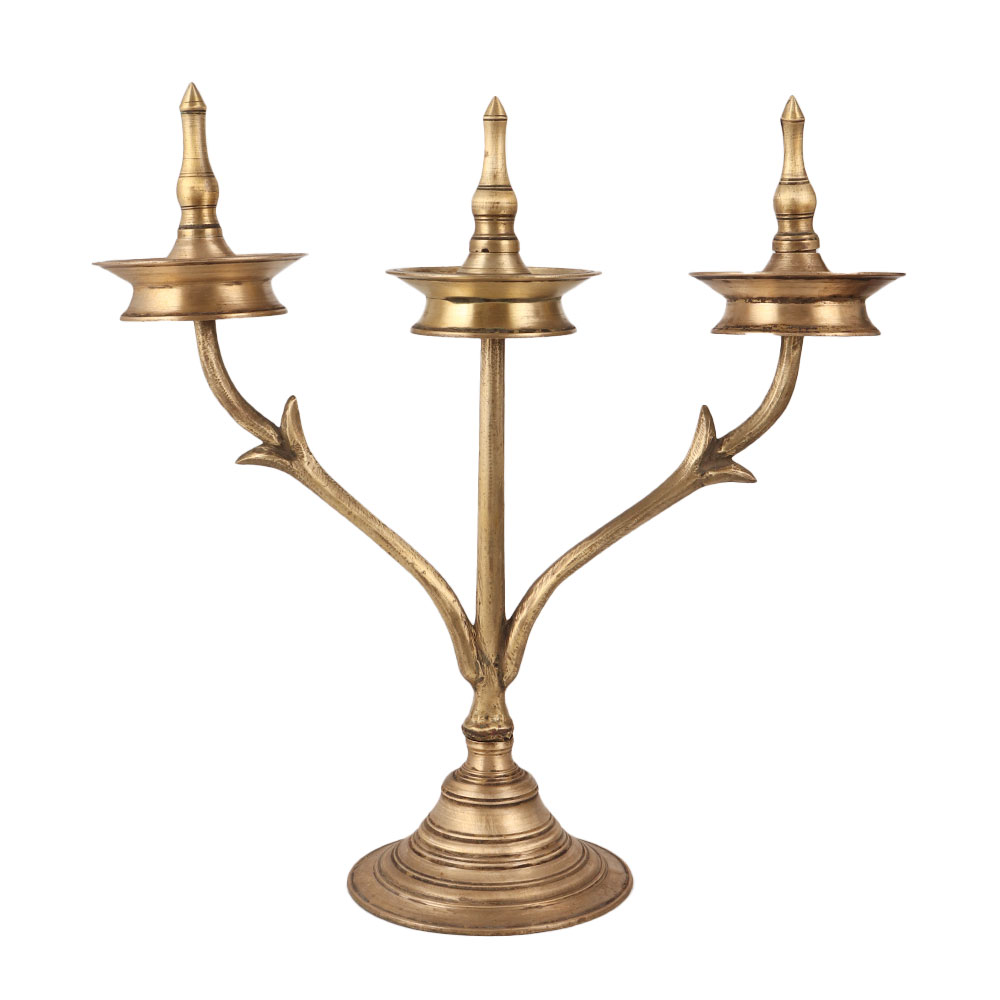 The antique finish of this oil lamp enhances its vintage charm, making it the perfect piece for both contemporary and traditional interiors. Its aged look is a reflection of the care and craftsmanship put into its creation. This finish allows it to blend seamlessly with a variety of interior styles, from traditional South Indian homes to modern decor settings.
