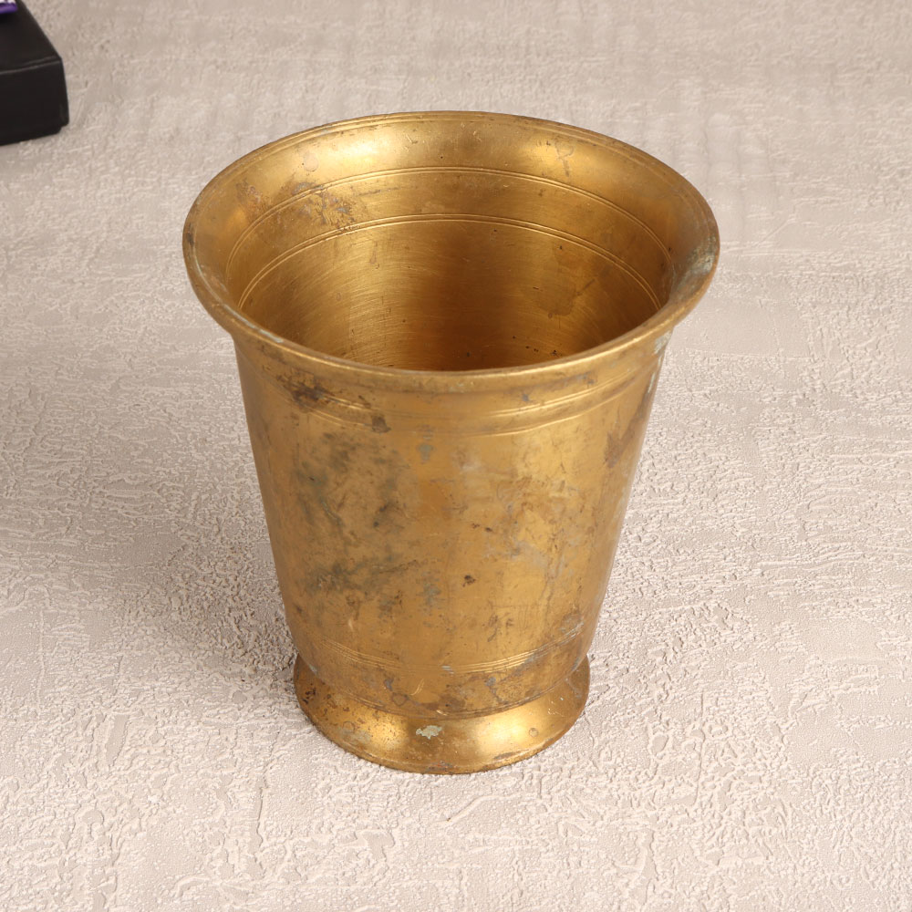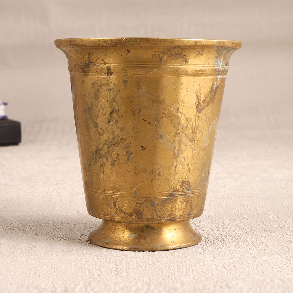 Add a touch of timeless elegance to your space with this exquisite Vintage Brass Holy Water Glass. Crafted with utmost precision by highly skilled Indian artisans, this ornate piece is a true testament to the rich tradition of South Indian artistry. Made from high-quality brass, it exudes a warm antique brown finish that lends an air of vintage charm to any setting. This holy water glass is not just a religious artefact but a symbol of craftsmanship and artistry. Its intricate detailing showcases the devotion of the artisans who painstakingly created it. Perfect for prayer, havan, or rituals, it gracefully holds holy water, imbuing your sacred moments with an air of reverence. Beyond religious ceremonies, this piece can also serve as a unique decor element. Place it in your home, office, restaurant, hotel, or cafe's prayer room to infuse your space with a sense of spirituality. Moreover, it doubles as a stunning vase for floral arrangements, adding a burst of natural beauty to your surroundings. Whether for yourself or as a thoughtful gift, this Vintage Brass Holy Water Glass is an excellent choice for special, festive, or auspicious occasions.
