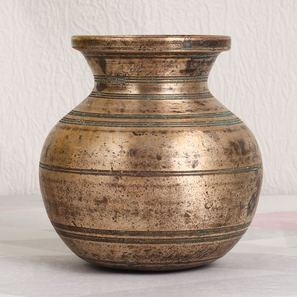Enhance your interior with the timeless charm of our Vintage Brass Holy Water Pot in an antique brown finish. Meticulously handcrafted by skilled Indian artisans, this exquisite piece is a testament to the rich tradition of South Indian artistry. Crafted from high-quality brass, it seamlessly blends elegance and functionality. This versatile piece can grace your home, office, restaurant, hotel, cafe, or shop as an indoor flower pot, infusing a touch of vintage allure into any space. Beyond its decorative appeal, the pot serves a sacred purpose. During havan, rituals, and auspicious occasions, it becomes the perfect vessel to hold holy water, adding a spiritual aura to your setting. Embrace tradition while showcasing your refined taste by adding this piece to your vintage collection. Its intricate design and warm, antique brown finish makes it a captivating conversation starter. Share the love by gifting this brass holy water pot to your loved ones on special, festive, or auspicious occasions.