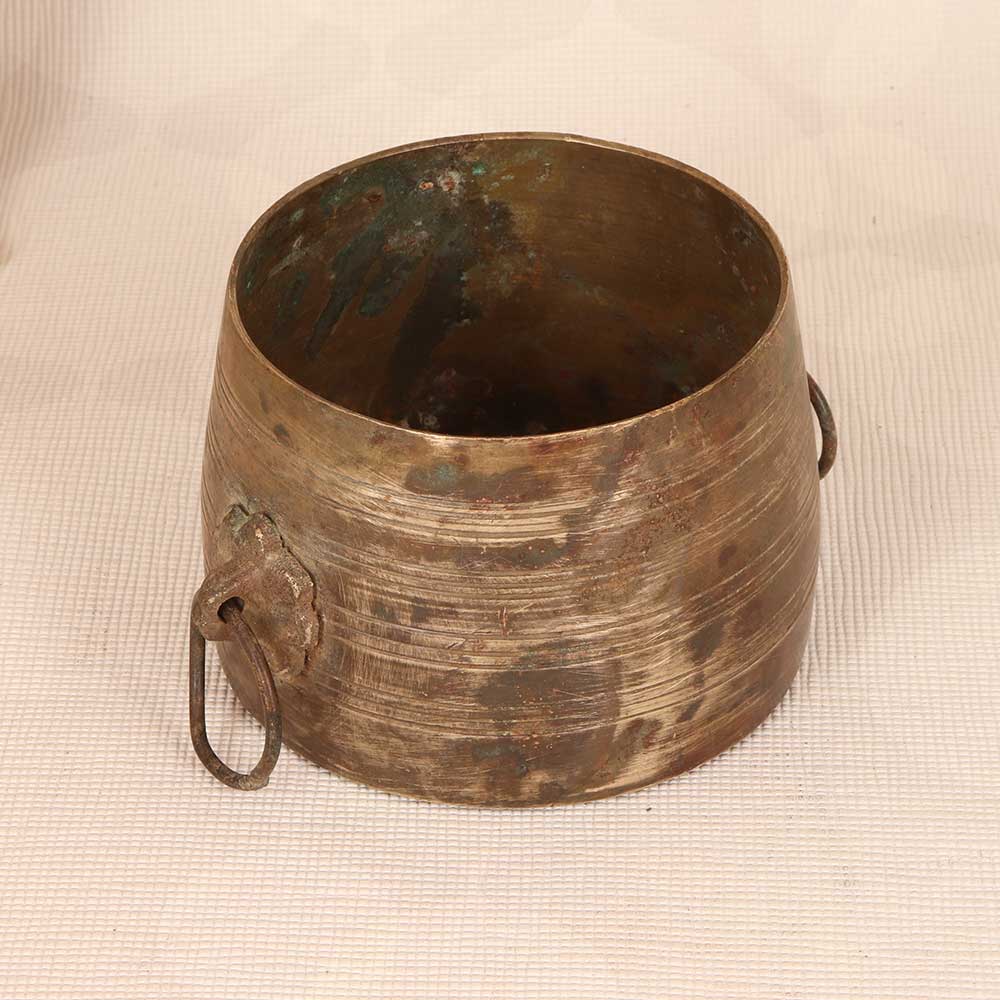 Make an antique statement with the brass measurement bowl. This vintage brass bowl from South India provides a glimpse into the past with its intricate hand hammered design. Once used for portioning rice before cooking, its artisanal look now lends rustic charm ideal for decor. Display its gleaming hammered texture and engraved measurements to infuse your home with old world character. The brass patina and pleasing heft add visual richness to coffee tables, shelves or countertops. Let its exotic origins inspire your interior decorating. Though no longer suited for food use, this brass bowl remains a decorative treasure. Its antiqued brass and handcrafted style from a bygone era create an authentic accent piece. Give your home a touch of history with this vintage brass bowl.