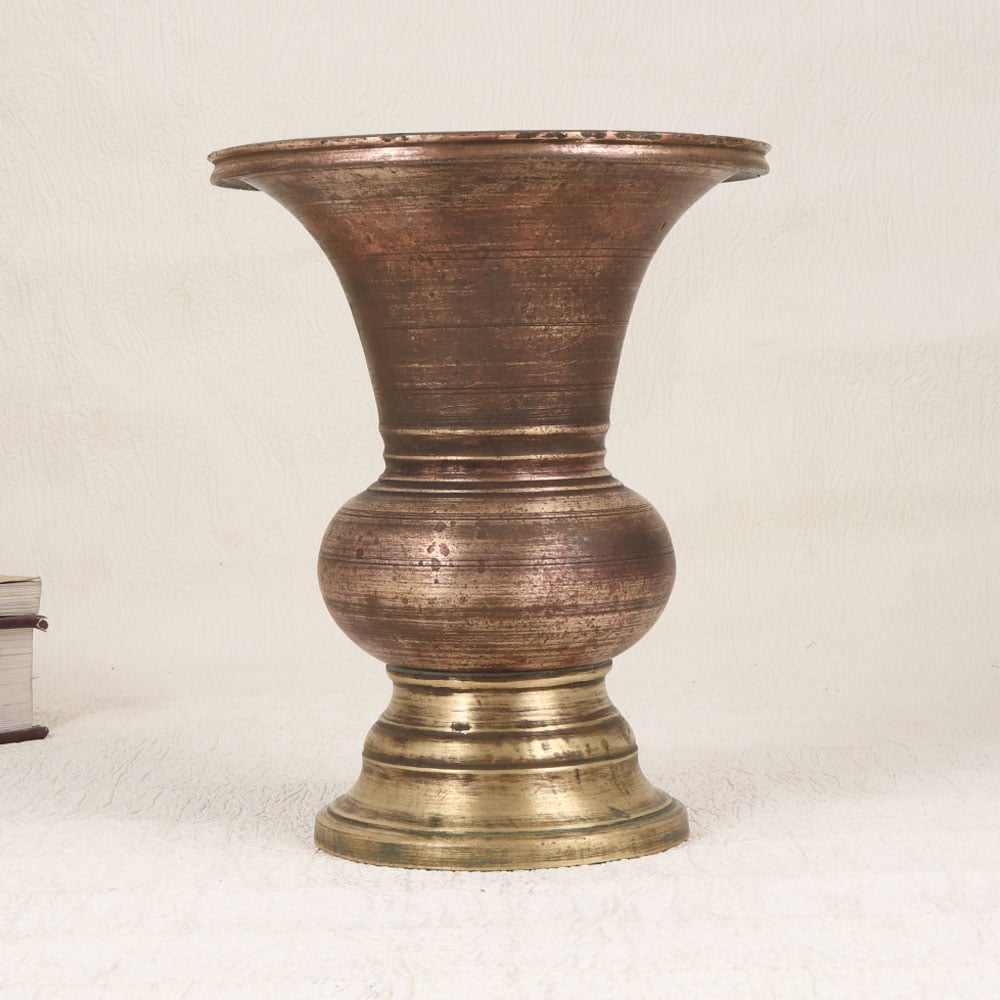 Adorn your interior with the timeless charm of our Vintage Brass Flower Pot which is a true masterpiece crafted by talented Indian artisans in the intricate style of South Indian Art. The pot boasts a rich antique brown finish, adding a touch of old-world elegance to any space. Handmade with precision and care, this exquisite piece is a testament to the artistry passed down through generations. Made from high-quality brass, the flower pot is not just a decorative item but a symbol of craftsmanship and heritage. Its versatile design makes it suitable for various settings, whether adorning your home, office, restaurant, hotel, or cafe. The warm, earthy tones and ornate detailing make it a captivating addition to vintage collections. This unique flower pot isn't just a statement piece but also a thoughtful gift for your loved ones on special, festive, or auspicious occasions. Its classic design transcends trends, ensuring a timeless appeal that will be cherished for years to come.