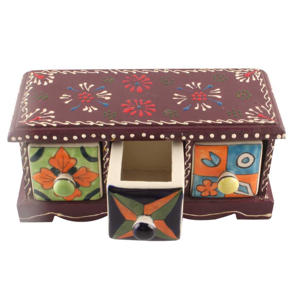 Spice Box-1437 Masala Rack Container Gift Item. Ceramic Drawers in Wooden Frame. The Spice Boxes are designed with different patterns. These boxes are made using natural wood which does not harm the purity of spices.