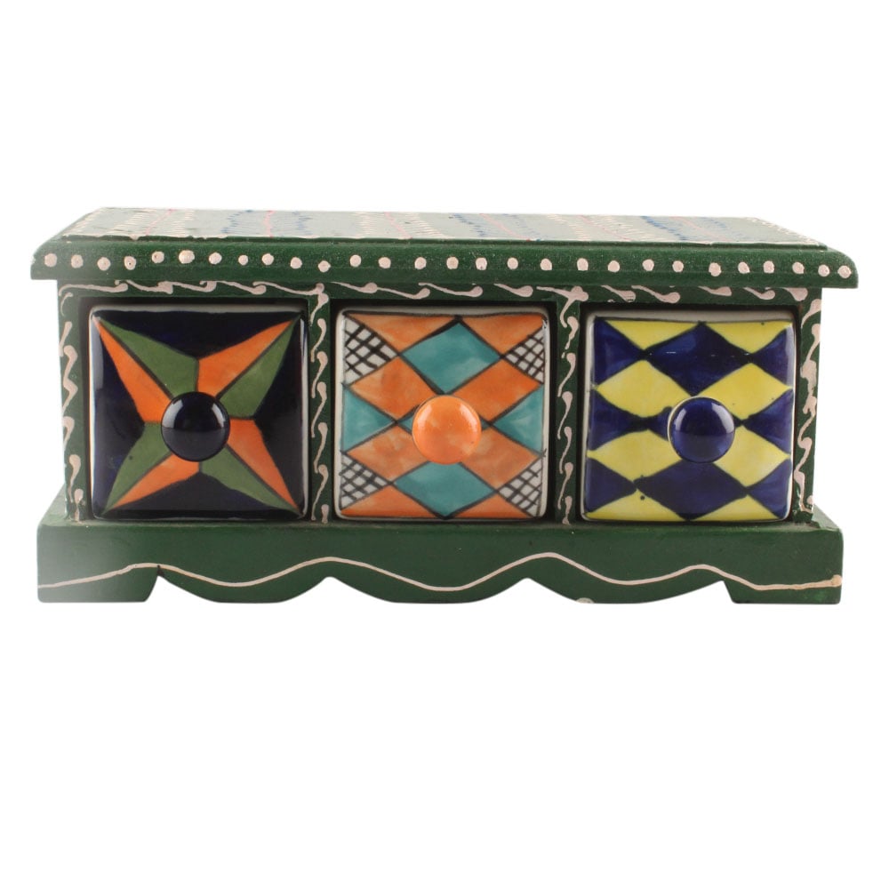 Spice Box-1441 Masala Rack Container Gift Item. Ceramic Drawers in Wooden Frame. The Spice Boxes are designed with different patterns. These boxes are made using natural wood which does not harm the purity of spices.