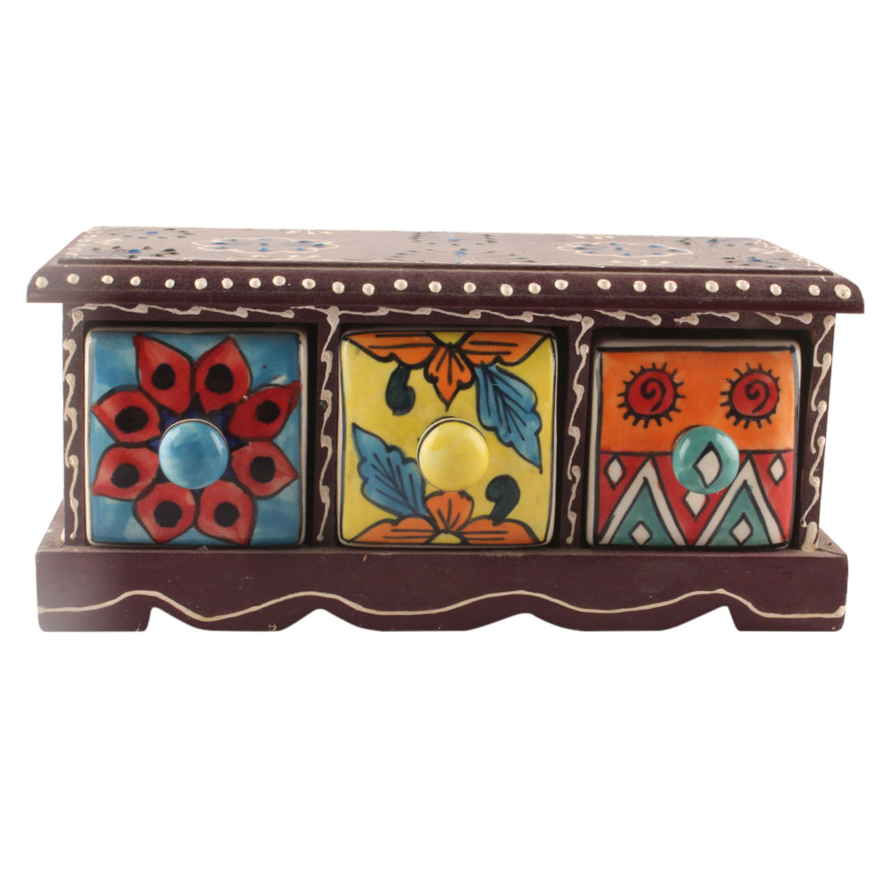 Spice Box-1442 Masala Rack Container Gift Item. Ceramic Drawers in Wooden Frame. The Spice Boxes are designed with different patterns. These boxes are made using natural wood which does not harm the purity of spices.