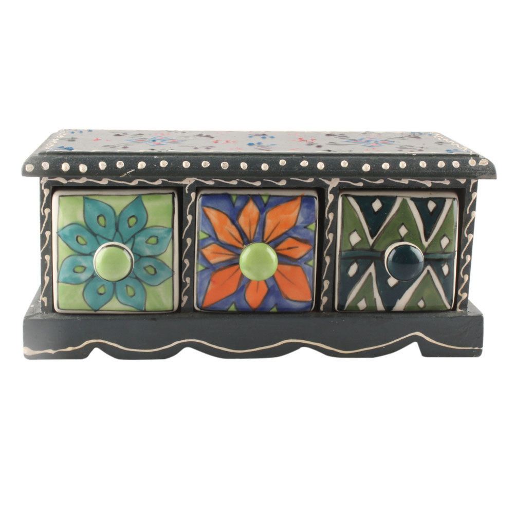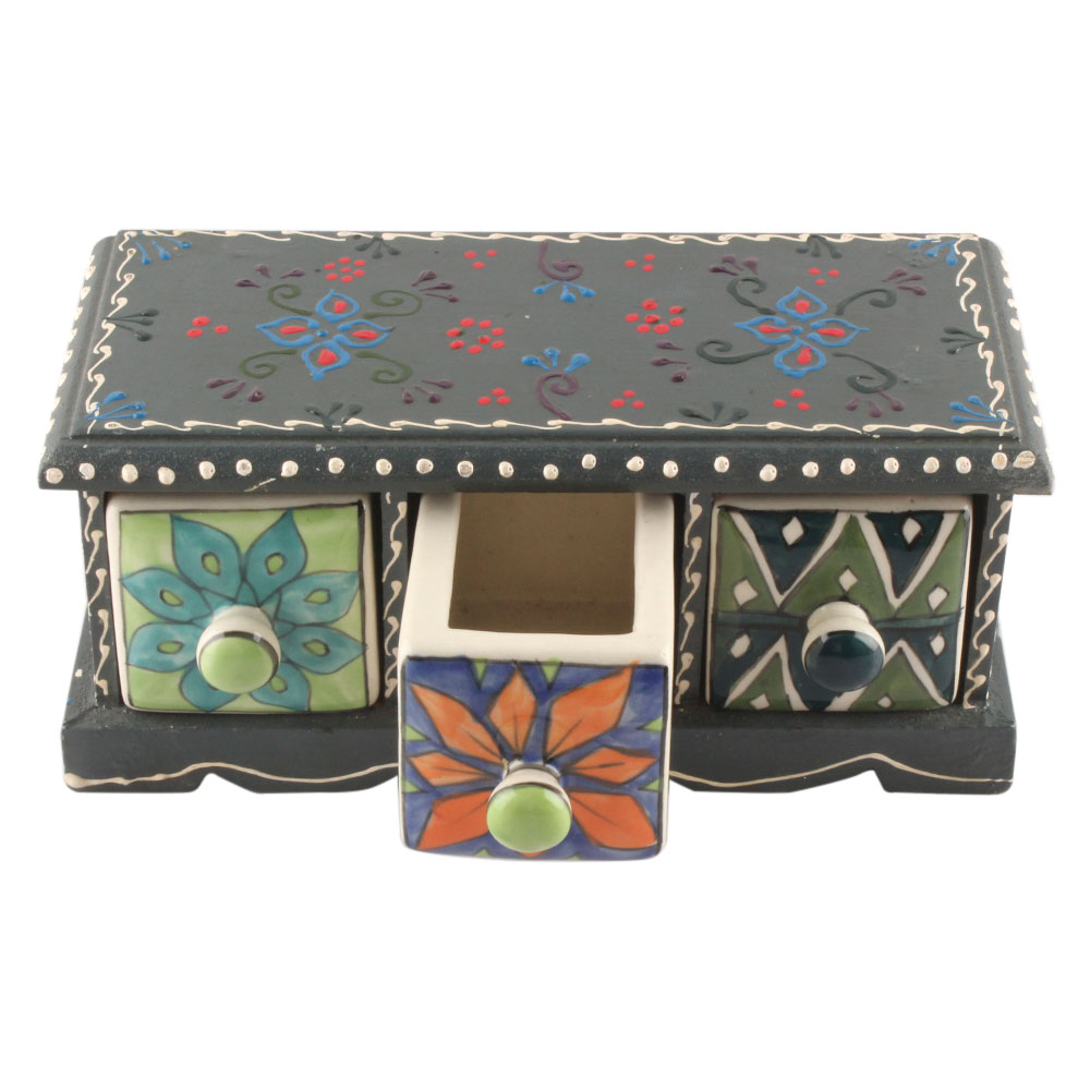 Spice Box-1443 Masala Rack Container Gift Item. Ceramic Drawers in Wooden Frame. The Spice Boxes are designed with different patterns. These boxes are made using natural wood which does not harm the purity of spices.
