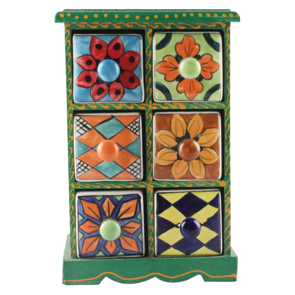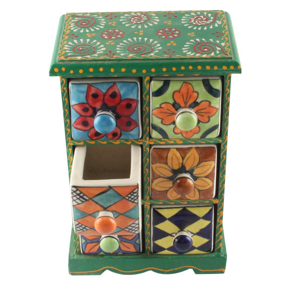 Spice Box-1455 Masala Rack Container Gift Item. Ceramic Drawers in Wooden Frame. The Spice Boxes are designed with different patterns. These boxes are made using natural wood which does not harm the purity of spices.