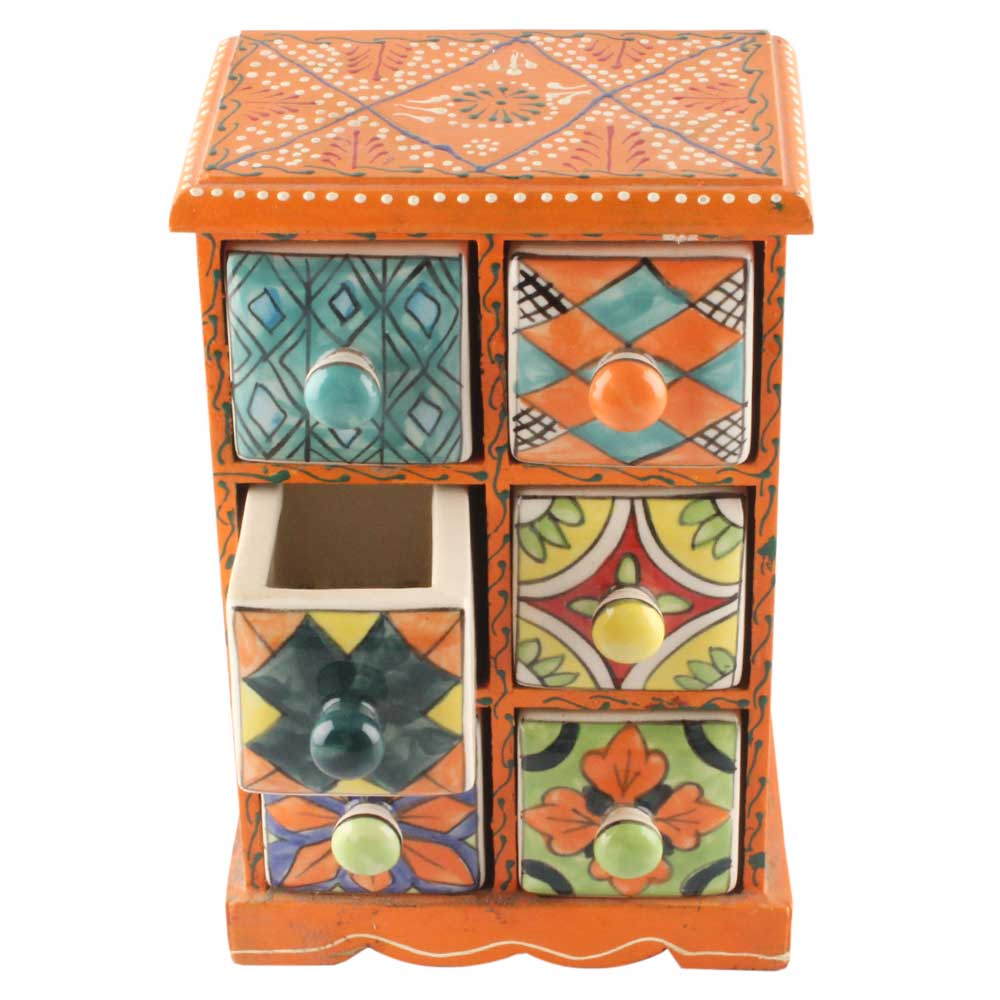 Spice Box-1460 Masala Rack Container Gift Item. Ceramic Drawers in Wooden Frame. The Spice Boxes are designed with different patterns. These boxes are made using natural wood which does not harm the purity of spices.