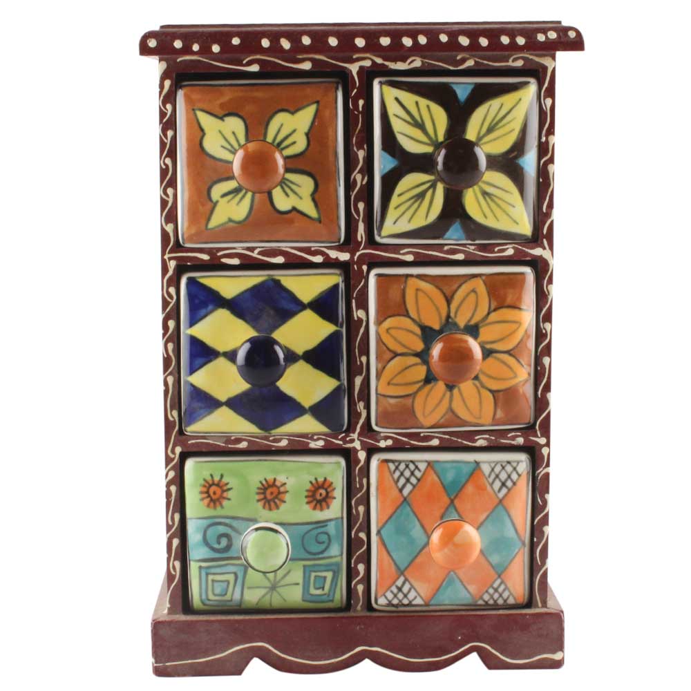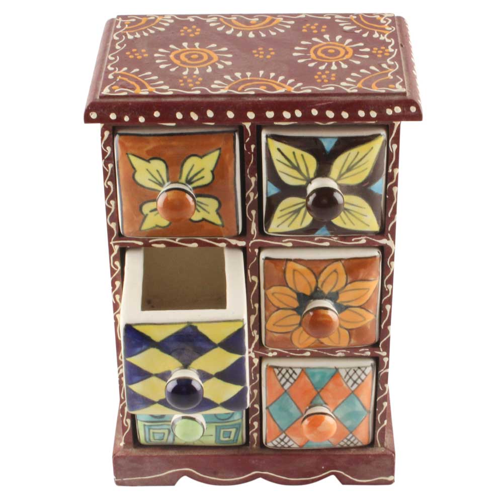Spice Box-1462 Masala Rack Container Gift Item. Ceramic Drawers in Wooden Frame. The Spice Boxes are designed with different patterns. These boxes are made using natural wood which does not harm the purity of spices.
