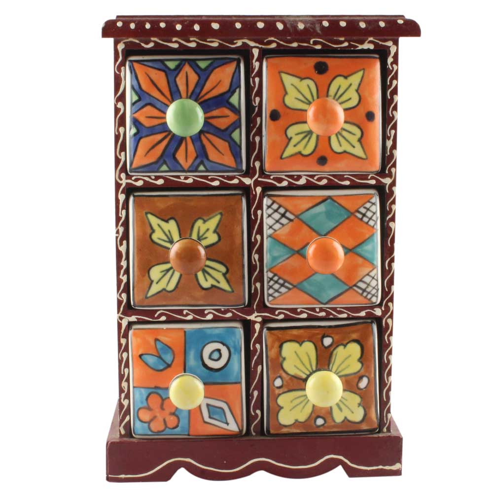 Spice Box-1468 Masala Rack Container Gift Item. Ceramic Drawers in Wooden Frame. The Spice Boxes are designed with different patterns. These boxes are made using natural wood which does not harm the purity of spices.