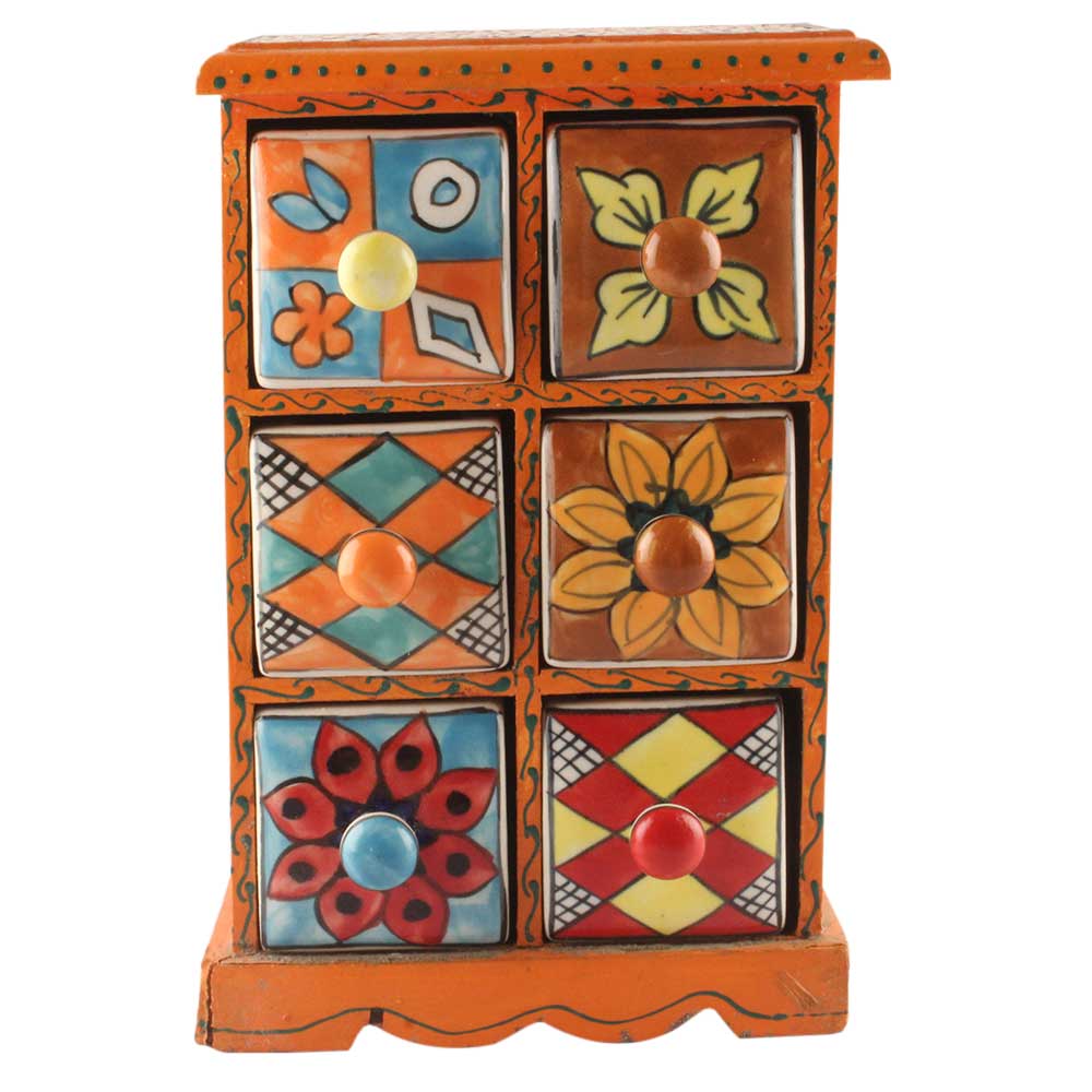 Spice Box-1469 Masala Rack Container Gift Item. Ceramic Drawers in Wooden Frame. The Spice Boxes are designed with different patterns. These boxes are made using natural wood which does not harm the purity of spices.