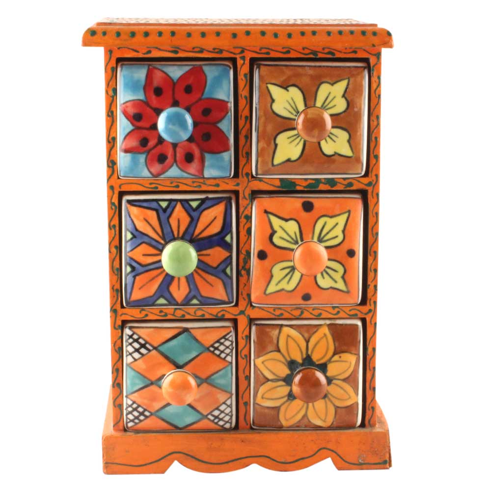 Spice Box-1473 Masala Rack Container Gift Item. Ceramic Drawers in Wooden Frame. The Spice Boxes are designed with different patterns. These boxes are made using natural wood which does not harm the purity of spices.