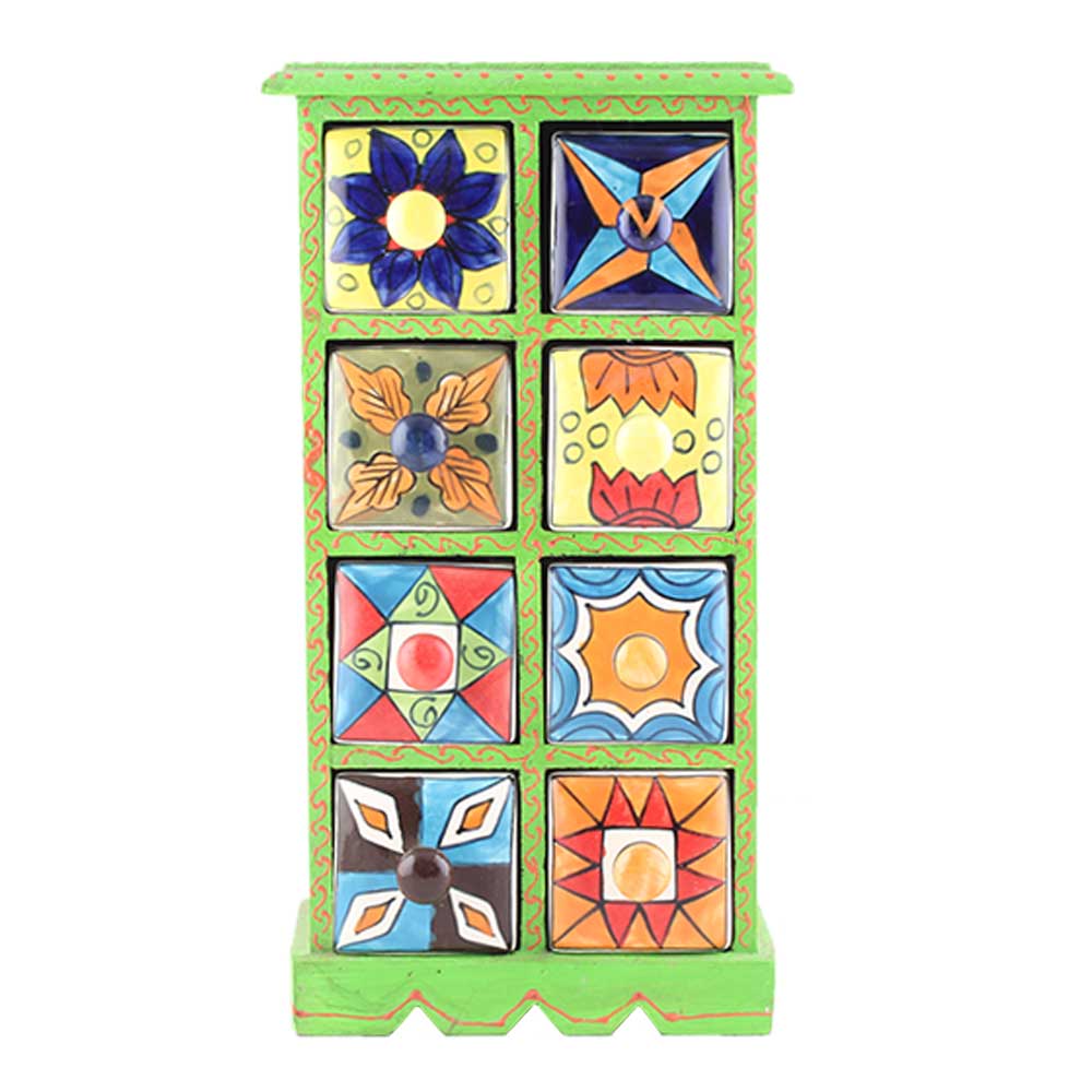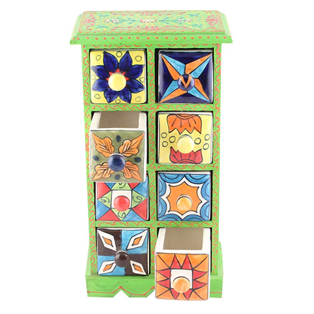 Spice Box-850 Masala Rack Container Gift Item. Ceramic Drawers in Wooden Frame. The Spice Boxes are designed with different patterns. These boxes are made using natural wood which does not harm the purity of spices.