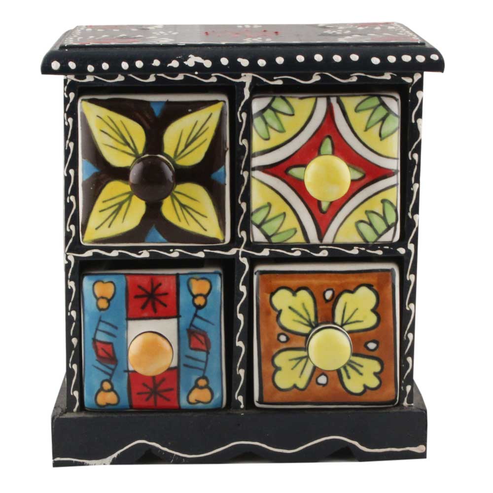 Spice Box-1236 Masala Rack Container Gift Item. Ceramic Drawers in Wooden Frame. The Spice Boxes are designed with different patterns. These boxes are made using natural wood which does not harm the purity of spices.