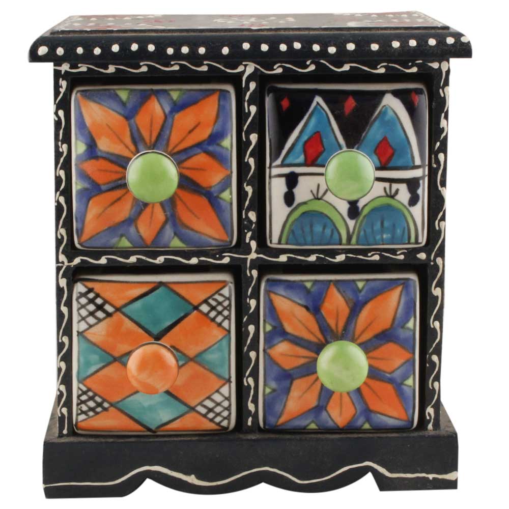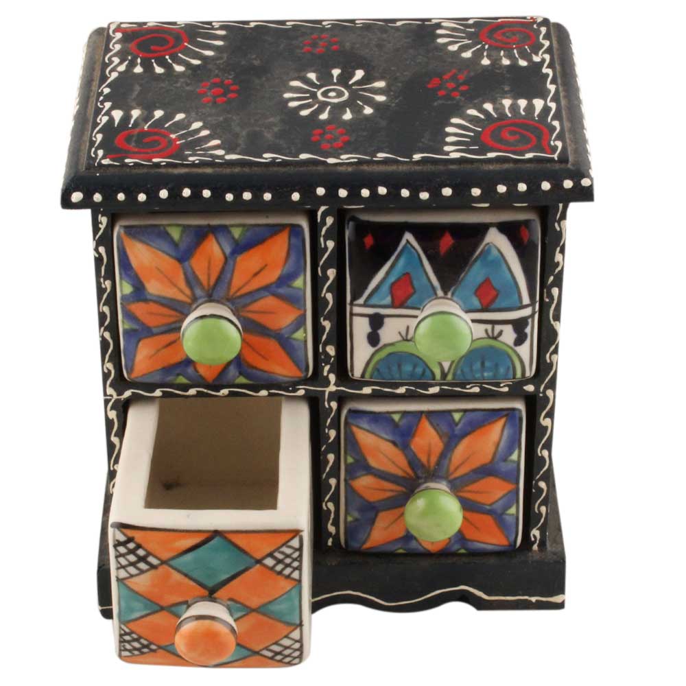 Spice Box-1245 Masala Rack Container Gift Item. Ceramic Drawers in Wooden Frame. The Spice Boxes are designed with different patterns. These boxes are made using natural wood which does not harm the purity of spices.