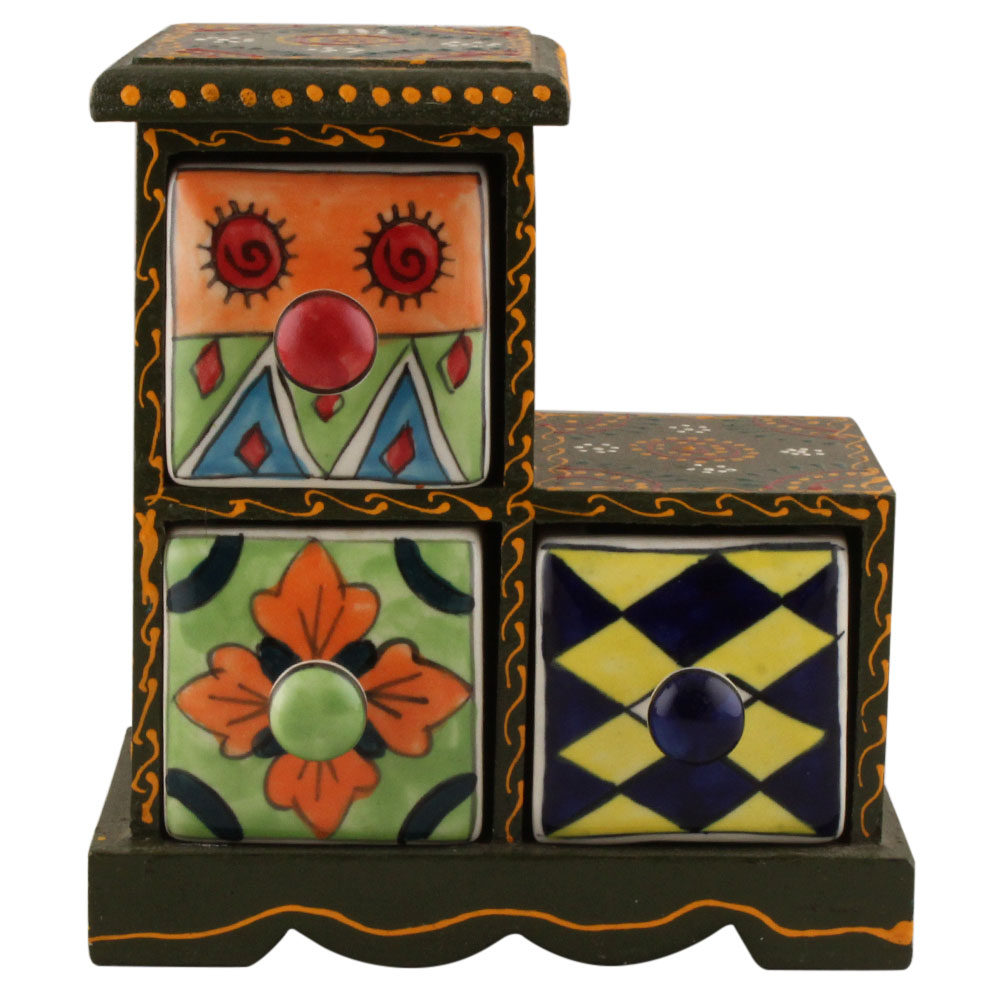 Spice Box-1275 Masala Rack Container Gift Item. Ceramic Drawers in Wooden Frame. The Spice Boxes are designed with different patterns. These boxes are made using natural wood which does not harm the purity of spices.