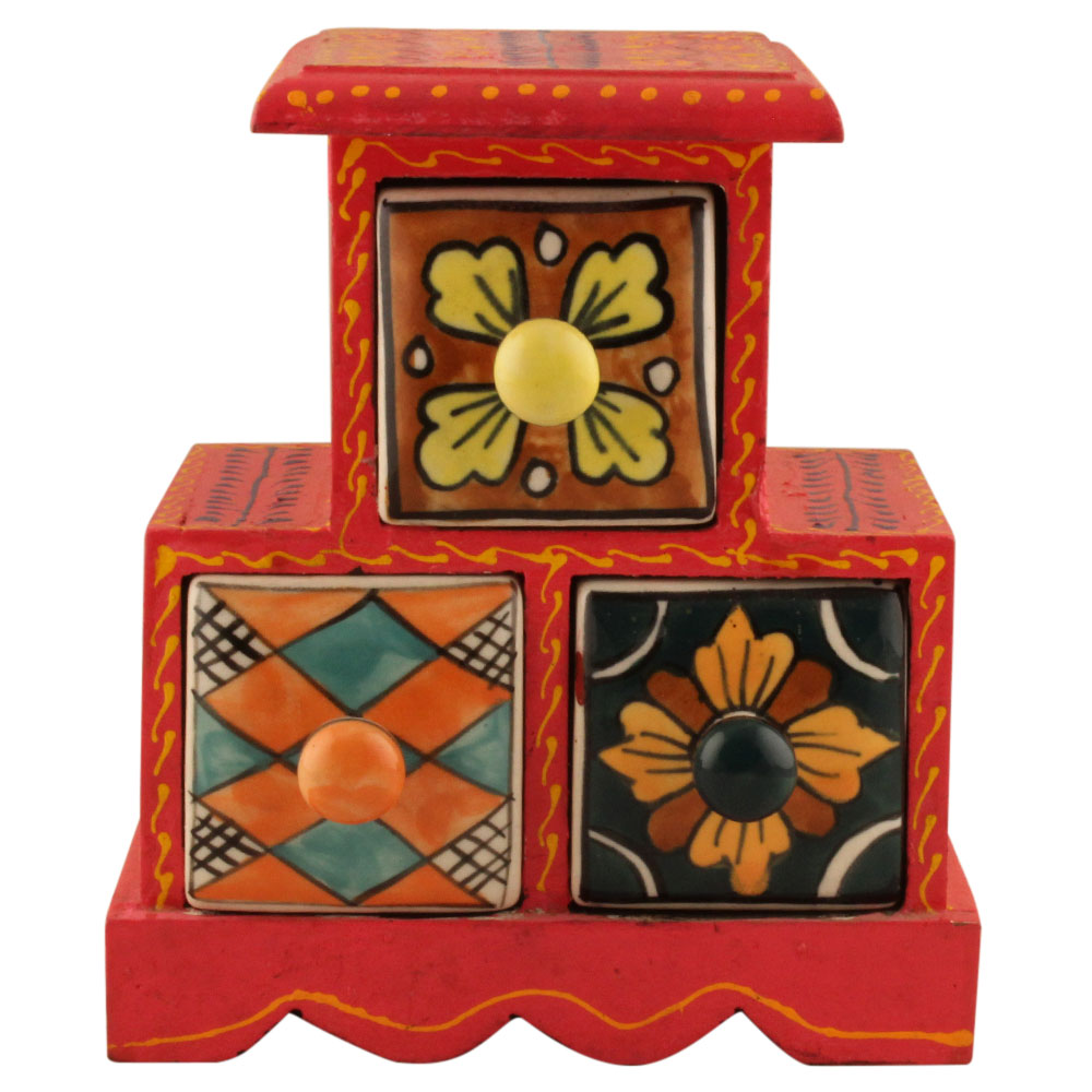 Spice Box-1276 Masala Rack Container Gift Item. Ceramic Drawers in Wooden Frame. The Spice Boxes are designed with different patterns. These boxes are made using natural wood which does not harm the purity of spices.
