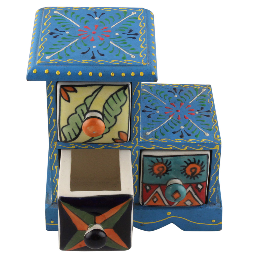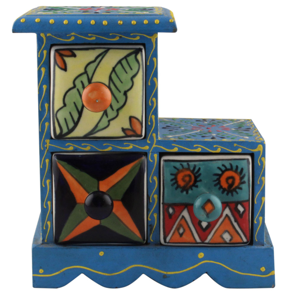 Spice Box-1279 Masala Rack Container Gift Item. Ceramic Drawers in Wooden Frame. The Spice Boxes are designed with different patterns. These boxes are made using natural wood which does not harm the purity of spices.