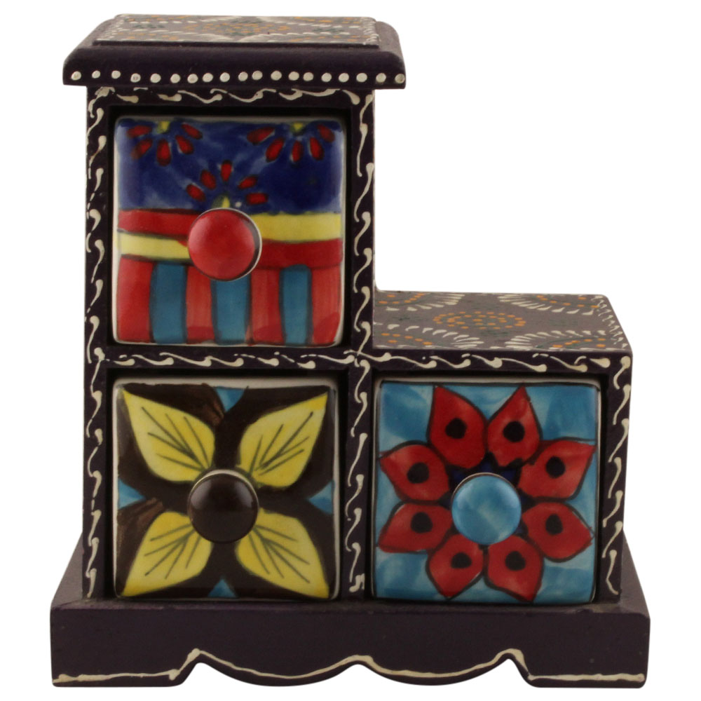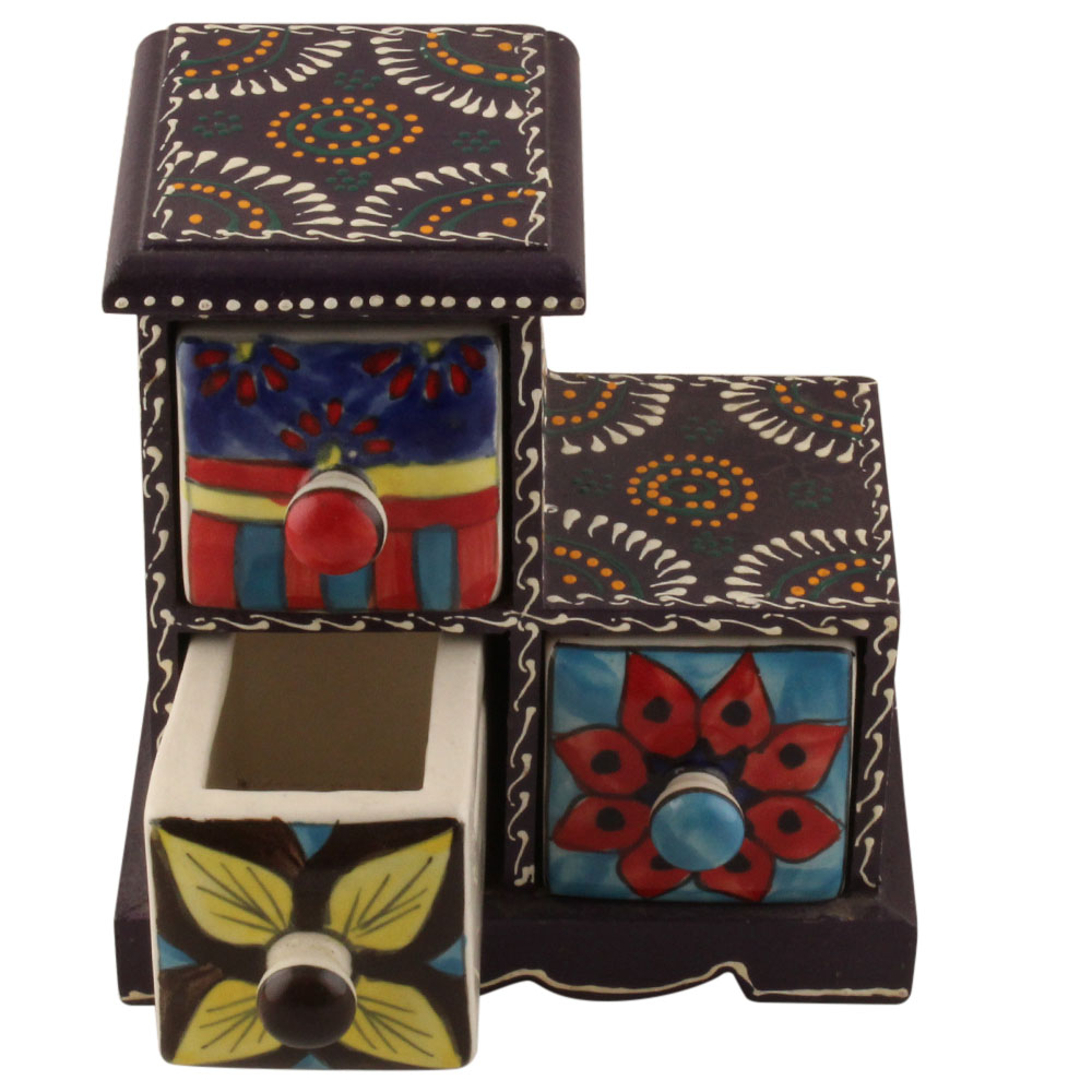 Spice Box-1281 Masala Rack Container Gift Item. Ceramic Drawers in Wooden Frame. The Spice Boxes are designed with different patterns. These boxes are made using natural wood which does not harm the purity of spices.