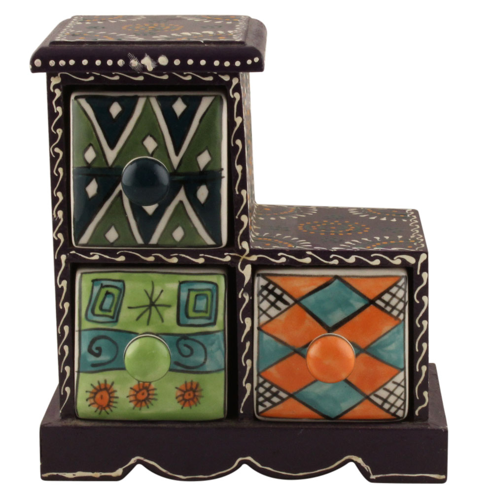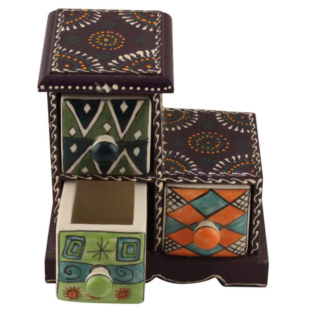 Spice Box-1288 Masala Rack Container Gift Item. Ceramic Drawers in Wooden Frame. The Spice Boxes are designed with different patterns. These boxes are made using natural wood which does not harm the purity of spices.