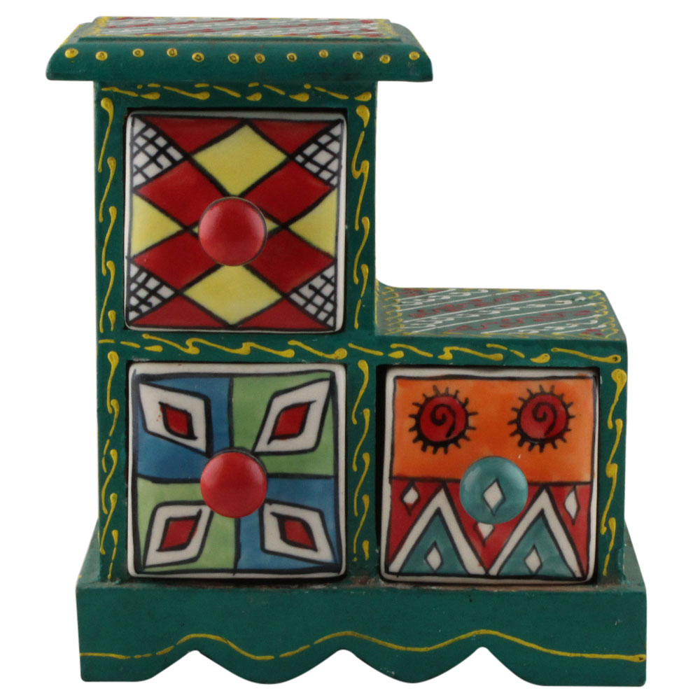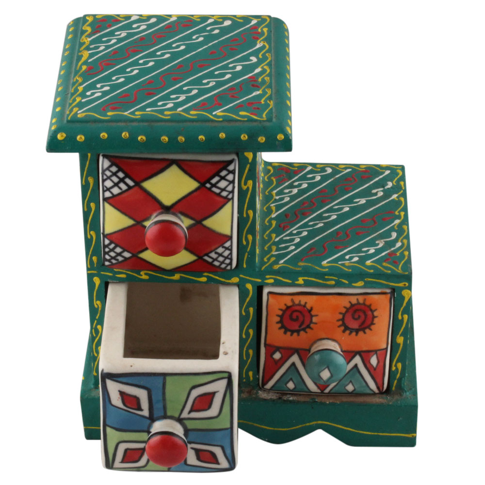 Spice Box-1294 Masala Rack Container Gift Item. Ceramic Drawers in Wooden Frame. The Spice Boxes are designed with different patterns. These boxes are made using natural wood which does not harm the purity of spices.