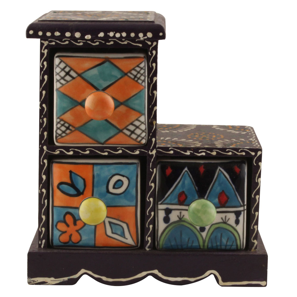 Spice Box-1305 Masala Rack Container Gift Item. Ceramic Drawers in Wooden Frame. The Spice Boxes are designed with different patterns. These boxes are made using natural wood which does not harm the purity of spices.