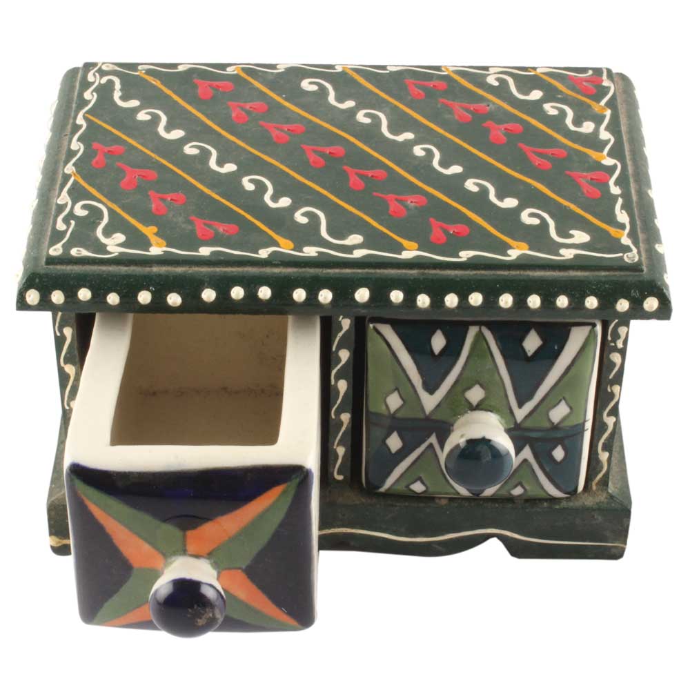Spice Box-1341 Masala Rack Container Gift Item. Ceramic Drawers in Wooden Frame. The Spice Boxes are designed with different patterns. These boxes are made using natural wood which does not harm the purity of spices.