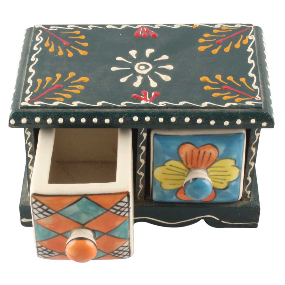 Spice Box-1342 Masala Rack Container Gift Item. Ceramic Drawers in Wooden Frame. The Spice Boxes are designed with different patterns. These boxes are made using natural wood which does not harm the purity of spices.