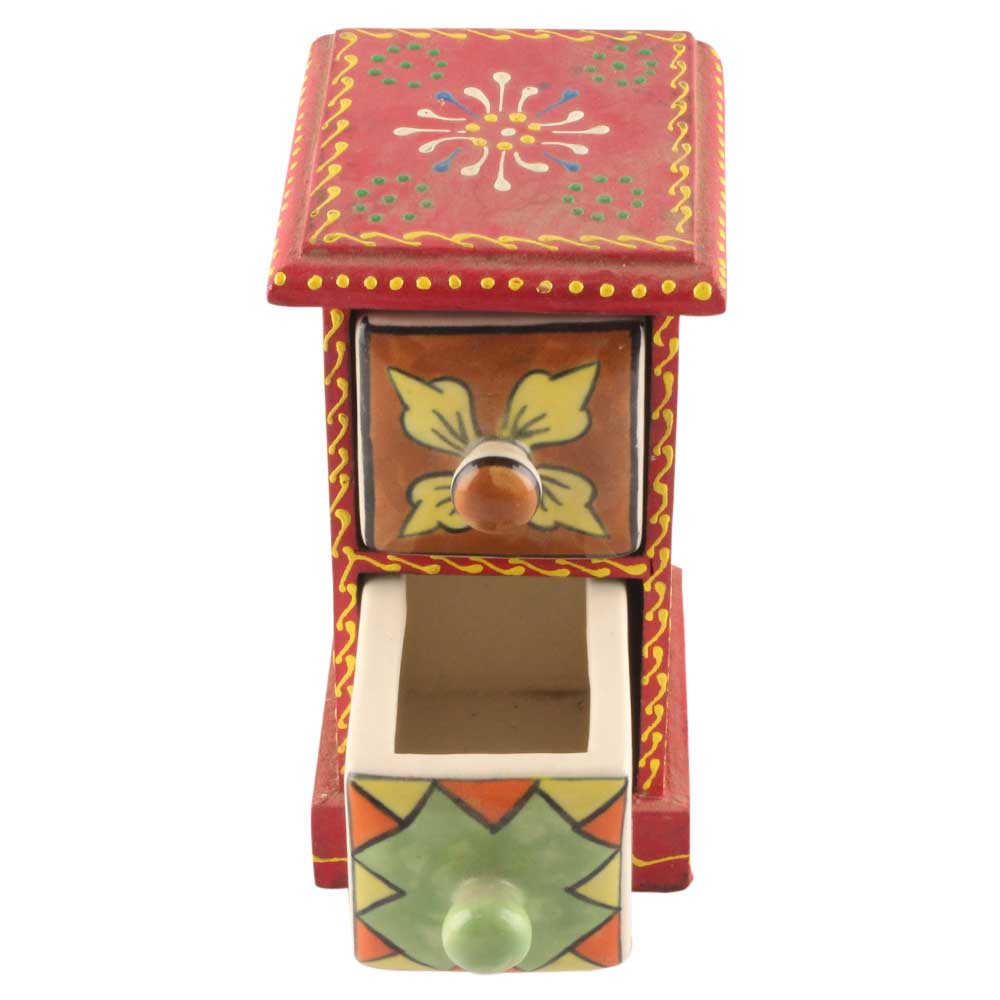 Spice Box-1363 Masala Rack Container Gift Item. Ceramic Drawers in Wooden Frame. The Spice Boxes are designed with different patterns. These boxes are made using natural wood which does not harm the purity of spices.