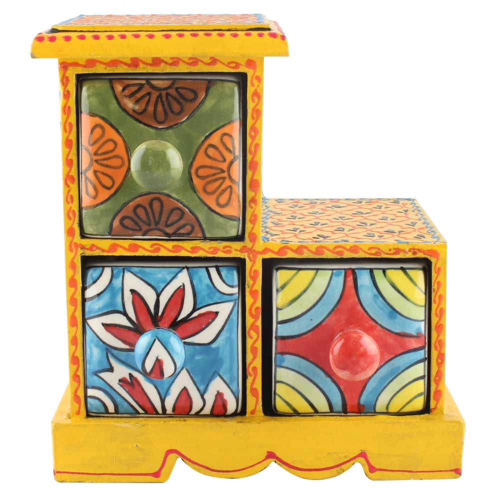 Spice Box-982 Masala Rack Container Gift Item. Ceramic Drawers in Wooden Frame. The Spice Boxes are designed with different patterns. These boxes are made using natural wood which does not harm the purity of spices.