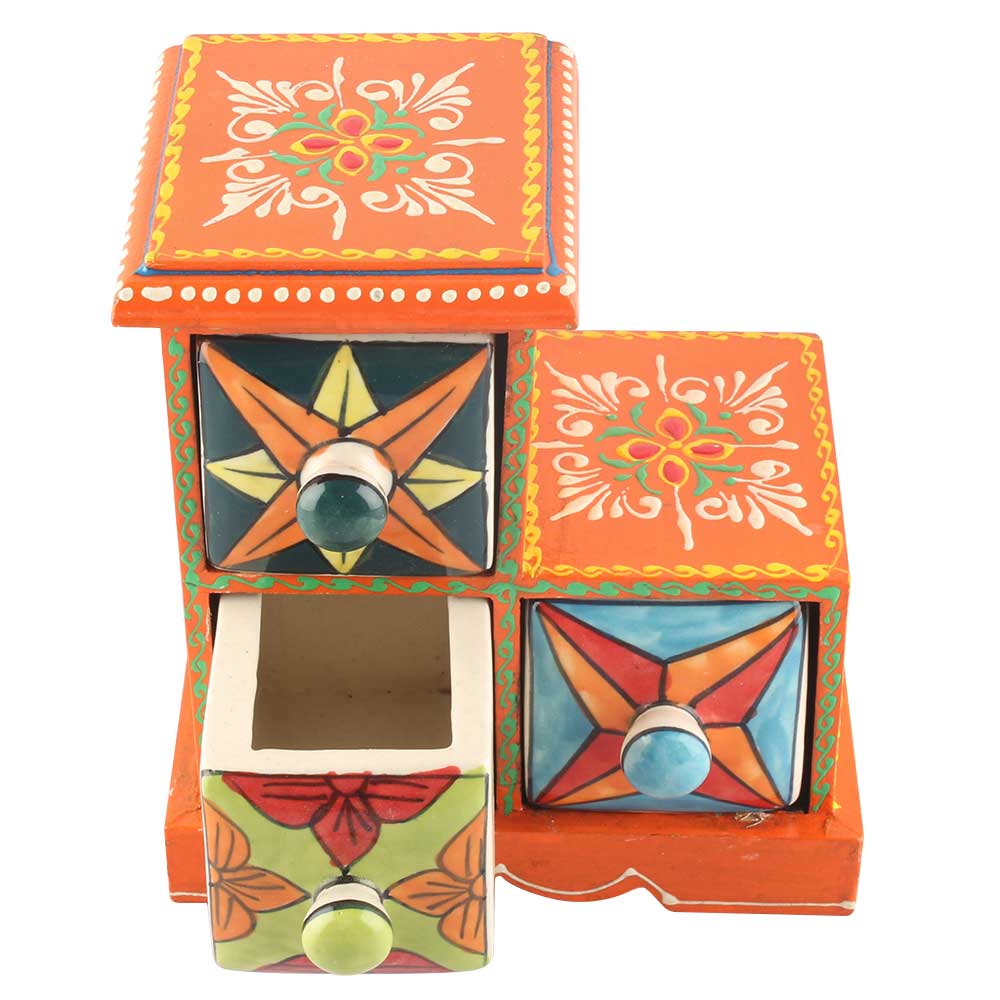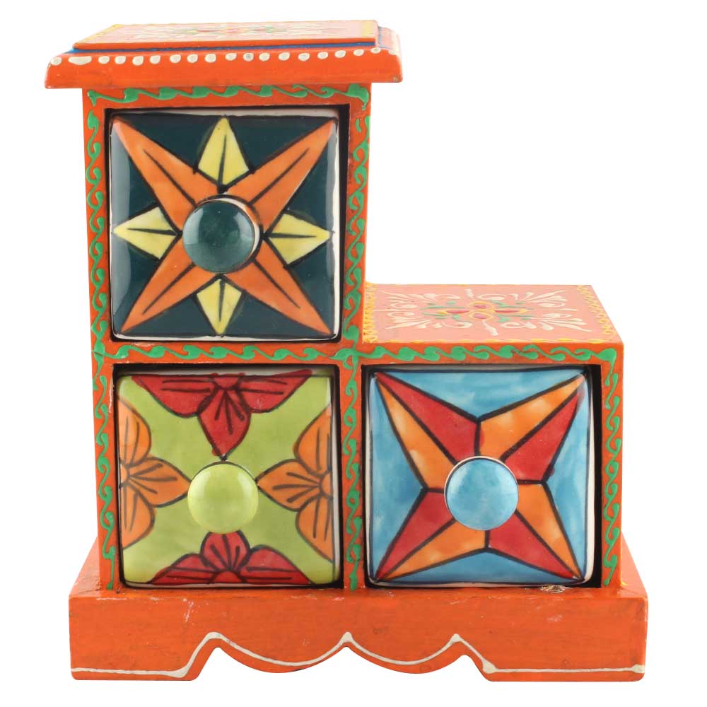 Spice Box-993 Masala Rack Container Gift Item. Ceramic Drawers in Wooden Frame. The Spice Boxes are designed with different patterns. These boxes are made using natural wood which does not harm the purity of spices.