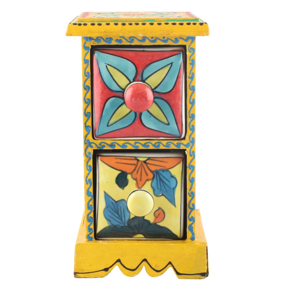 Spice Box-1019 Masala Rack Container Gift Item. Ceramic Drawers in Wooden Frame. The Spice Boxes are designed with different patterns. These boxes are made using natural wood which does not harm the purity of spices.