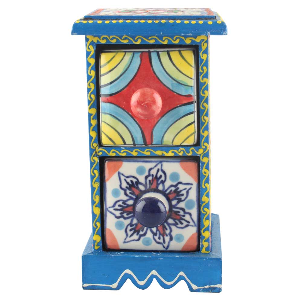 Spice Box-1043 Masala Rack Container Gift Item. Ceramic Drawers in Wooden Frame. The Spice Boxes are designed with different patterns. These boxes are made using natural wood which does not harm the purity of spices.