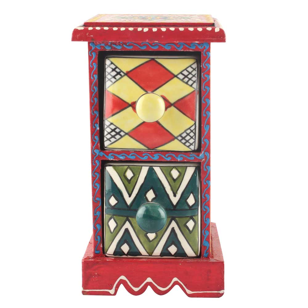 Spice Box-1053 Masala Rack Container Gift Item. Ceramic Drawers in Wooden Frame. The Spice Boxes are designed with different patterns. These boxes are made using natural wood which does not harm the purity of spices.
