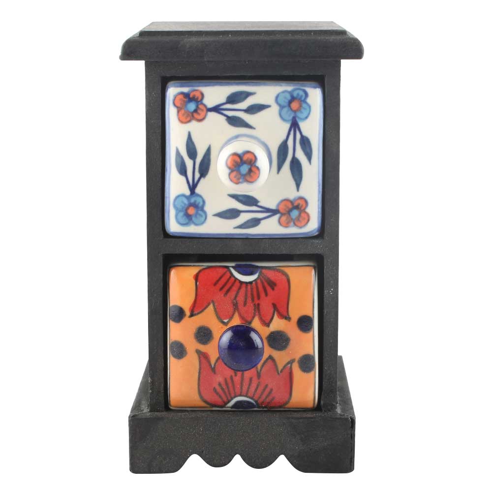 Spice Box-1057 Masala Rack Container Gift Item. Ceramic Drawers in Wooden Frame. The Spice Boxes are designed with different patterns. These boxes are made using natural wood which does not harm the purity of spices.