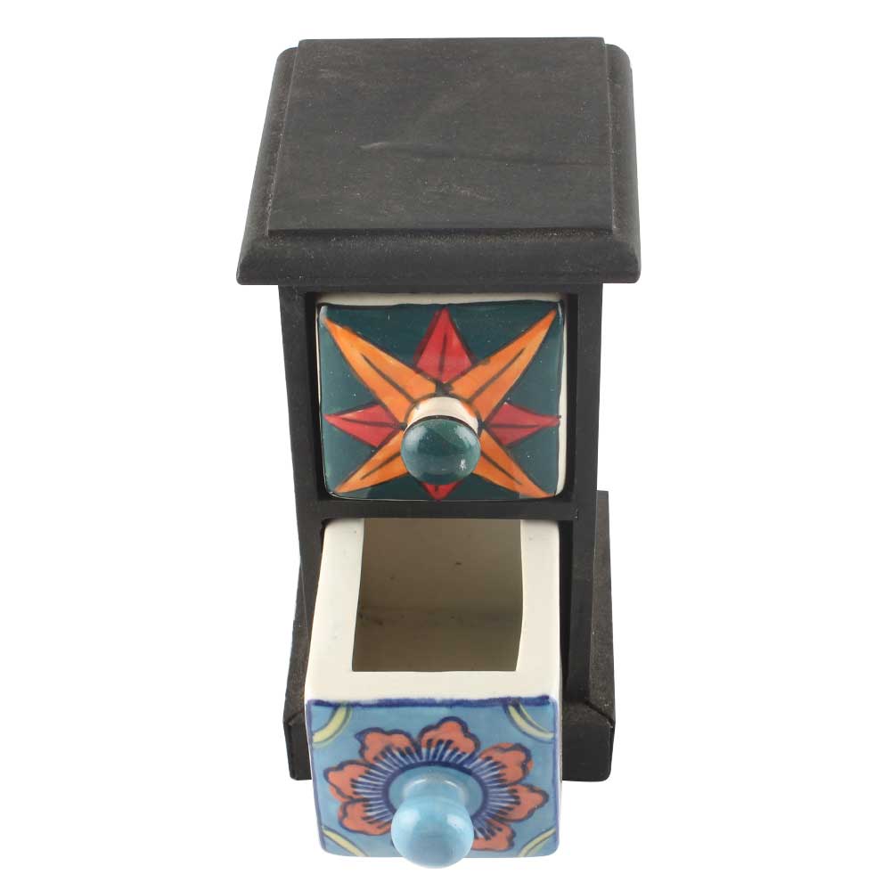 Spice Box-1072 Masala Rack Container Gift Item. Ceramic Drawers in Wooden Frame. The Spice Boxes are designed with different patterns. These boxes are made using natural wood which does not harm the purity of spices.