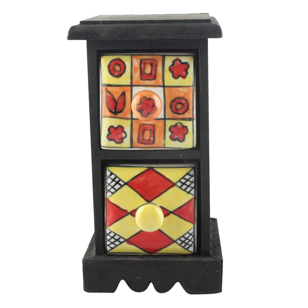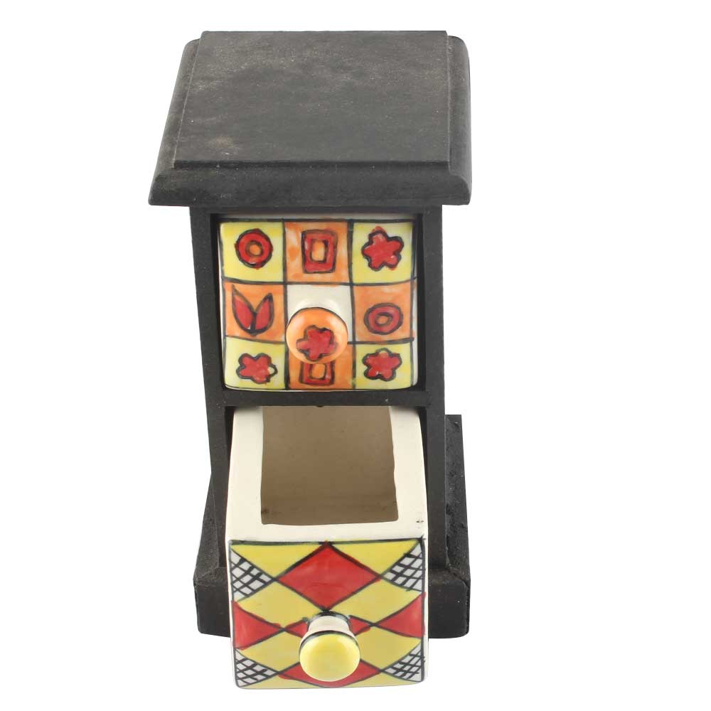 Spice Box-1074 Masala Rack Container Gift Item. Ceramic Drawers in Wooden Frame. The Spice Boxes are designed with different patterns. These boxes are made using natural wood which does not harm the purity of spices.