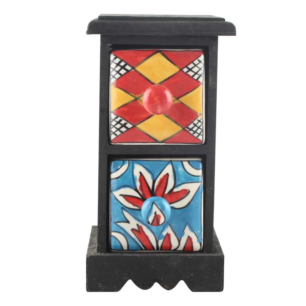 Spice Box-1096 Masala Rack Container Gift Item. Ceramic Drawers in Wooden Frame. The Spice Boxes are designed with different patterns. These boxes are made using natural wood which does not harm the purity of spices.