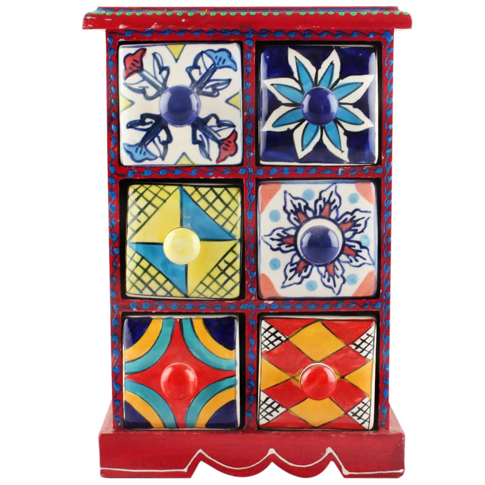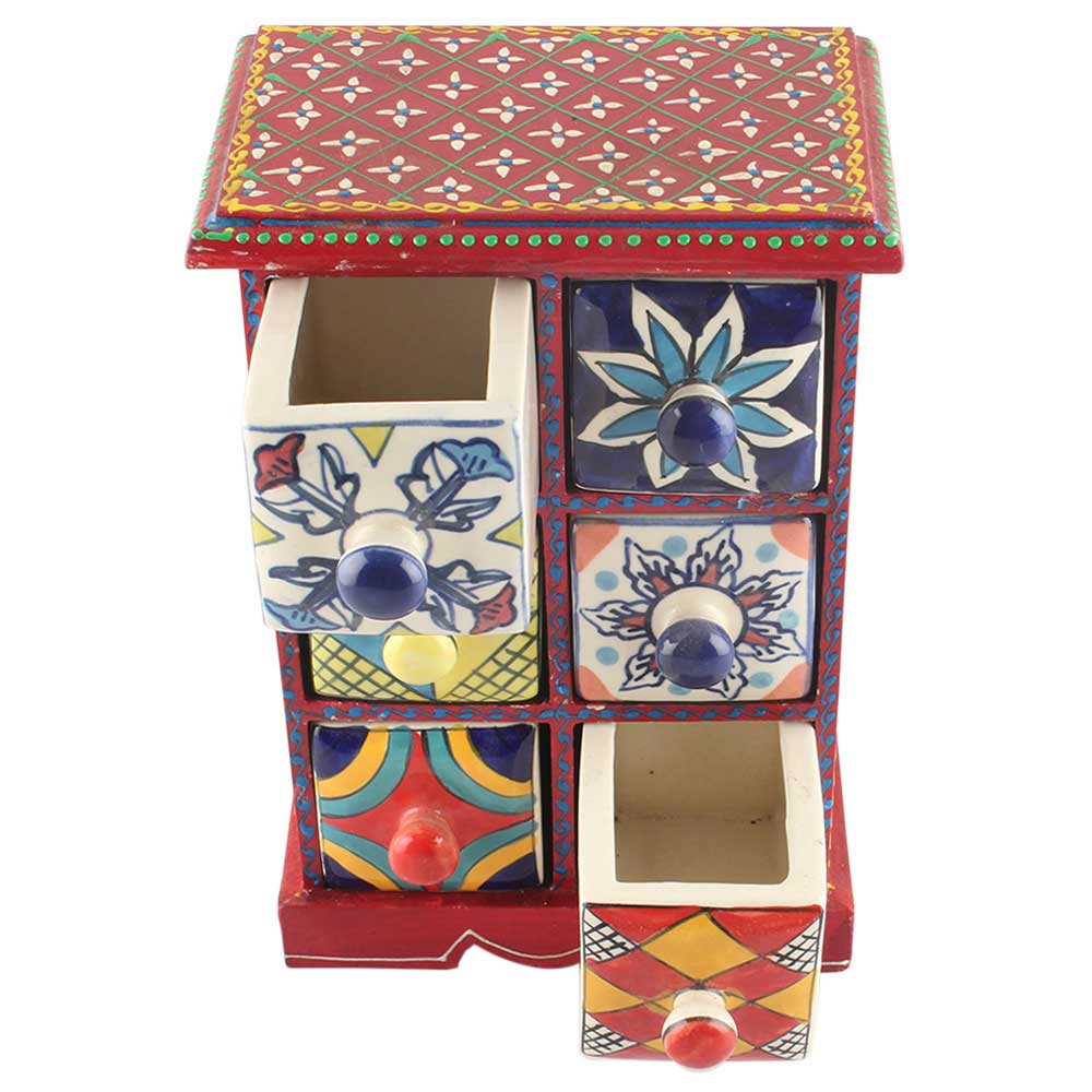 Spice Box-1106 Masala Rack Container Gift Item. Ceramic Drawers in Wooden Frame. The Spice Boxes are designed with different patterns. These boxes are made using natural wood which does not harm the purity of spices.
