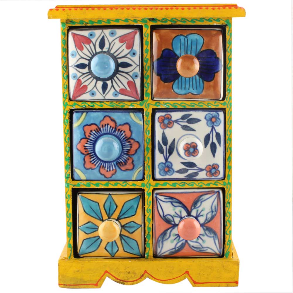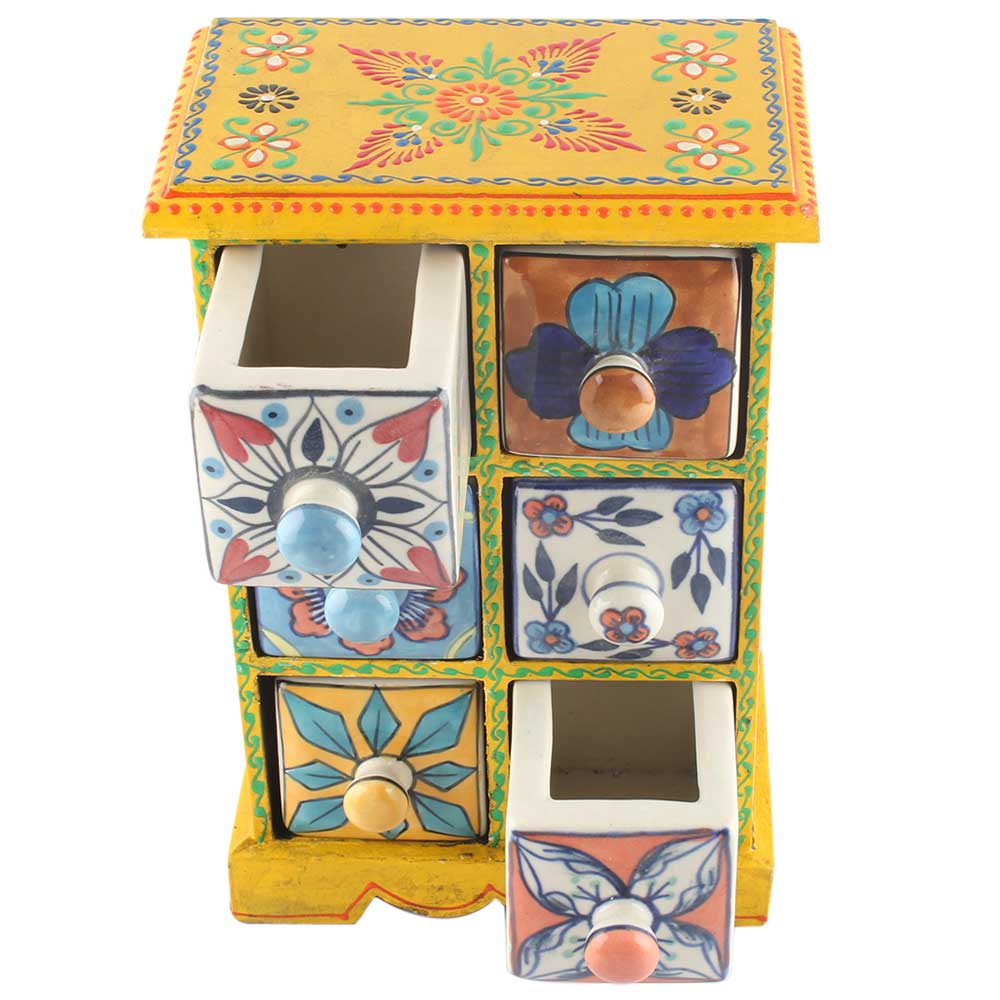 Spice Box-1121 Masala Rack Container Gift Item. Ceramic Drawers in Wooden Frame. The Spice Boxes are designed with different patterns. These boxes are made using natural wood which does not harm the purity of spices.