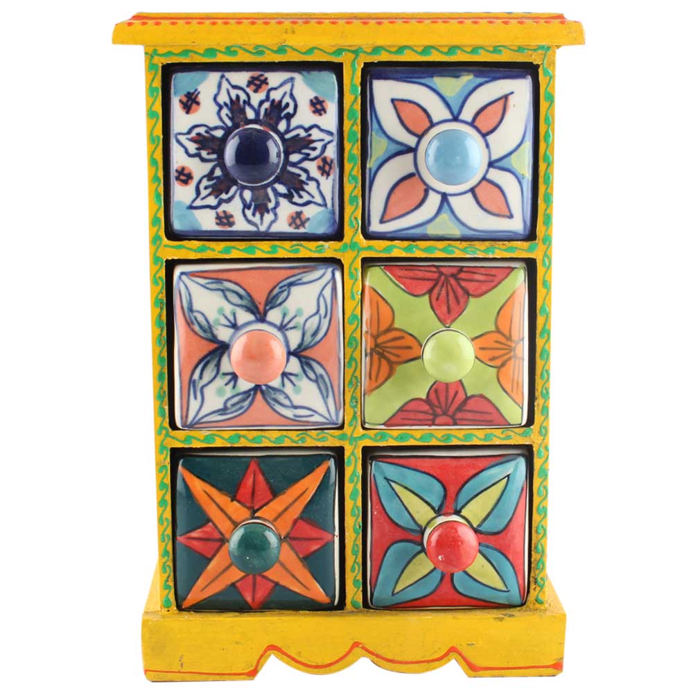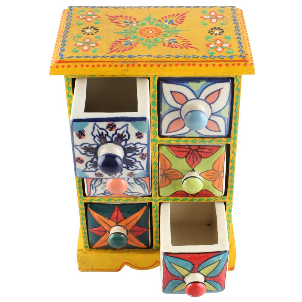 Spice Box-1125 Masala Rack Container Gift Item. Ceramic Drawers in Wooden Frame. The Spice Boxes are designed with different patterns. These boxes are made using natural wood which does not harm the purity of spices.