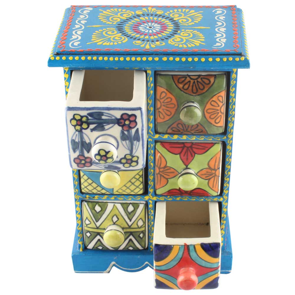 Spice Box-1136 Masala Rack Container Gift Item. Ceramic Drawers in Wooden Frame. The Spice Boxes are designed with different patterns. These boxes are made using natural wood which does not harm the purity of spices.
