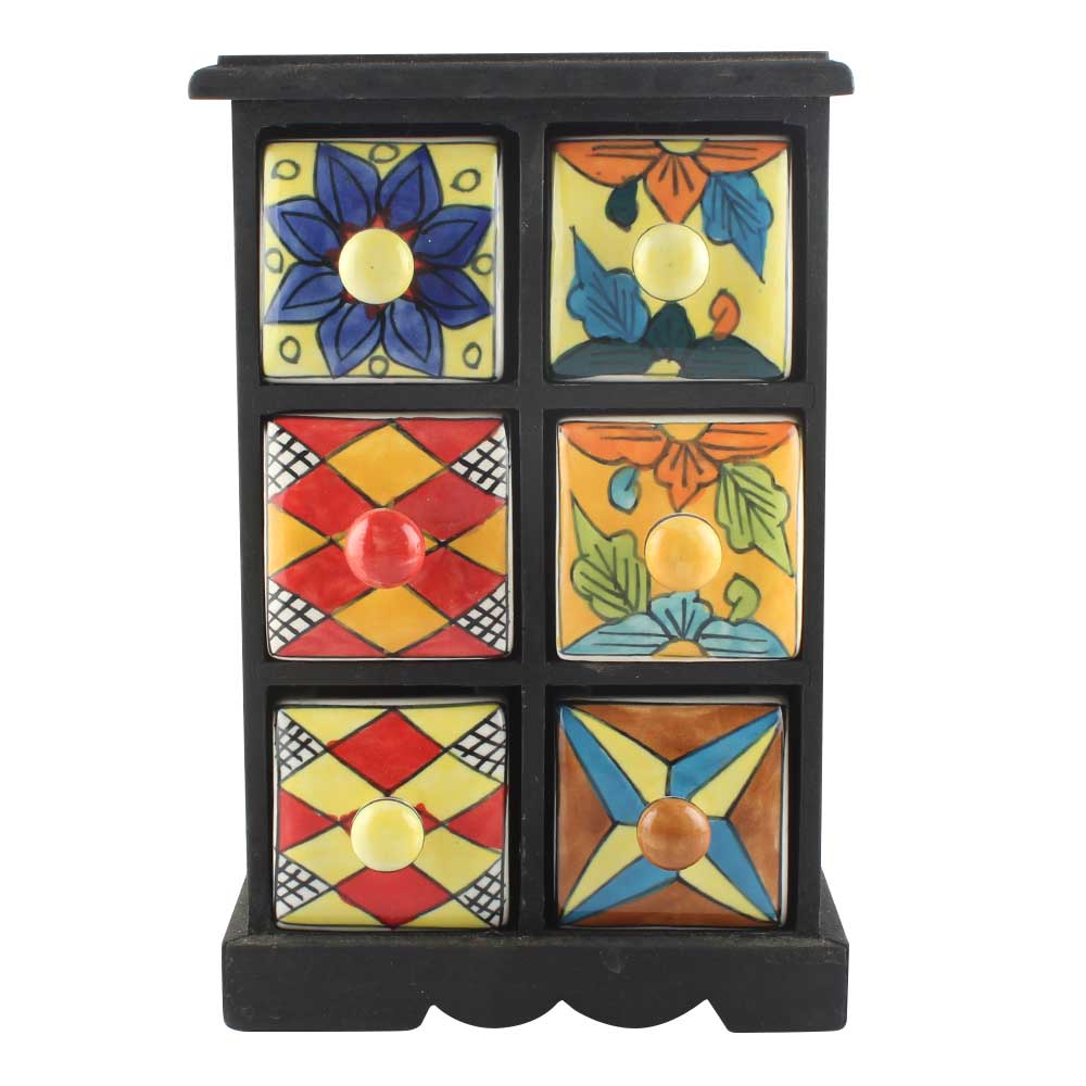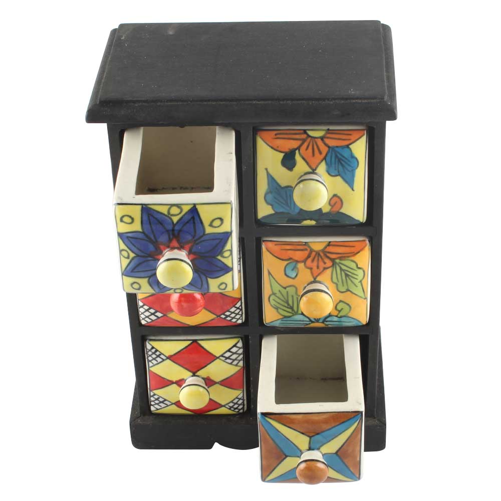 Spice Box-1159 Masala Rack Container Gift Item. Ceramic Drawers in Wooden Frame. The Spice Boxes are designed with different patterns. These boxes are made using natural wood which does not harm the purity of spices.