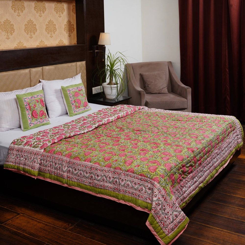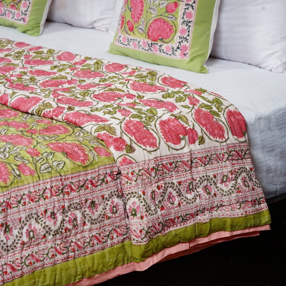 This pink and green Malmal (Voile) quilt beautifully captures the essence of Indian craftsmanship with its vivid hand-block printed floral patterns. Crafted from premium cotton voile, it is soft, lightweight, and breathable — perfect for all-season use. Expertly handmade and quality-checked by Indianshelf for lasting beauty and authenticity.