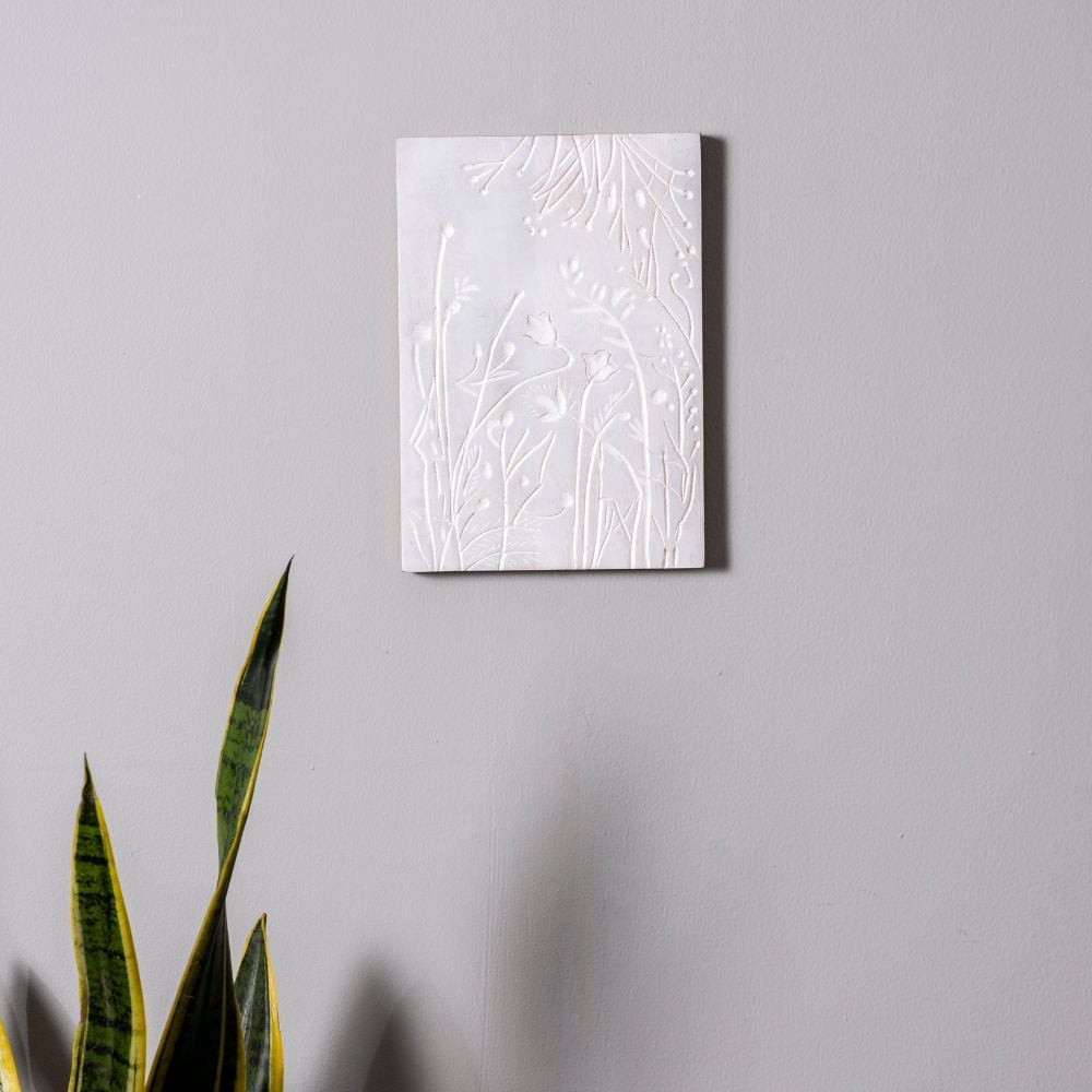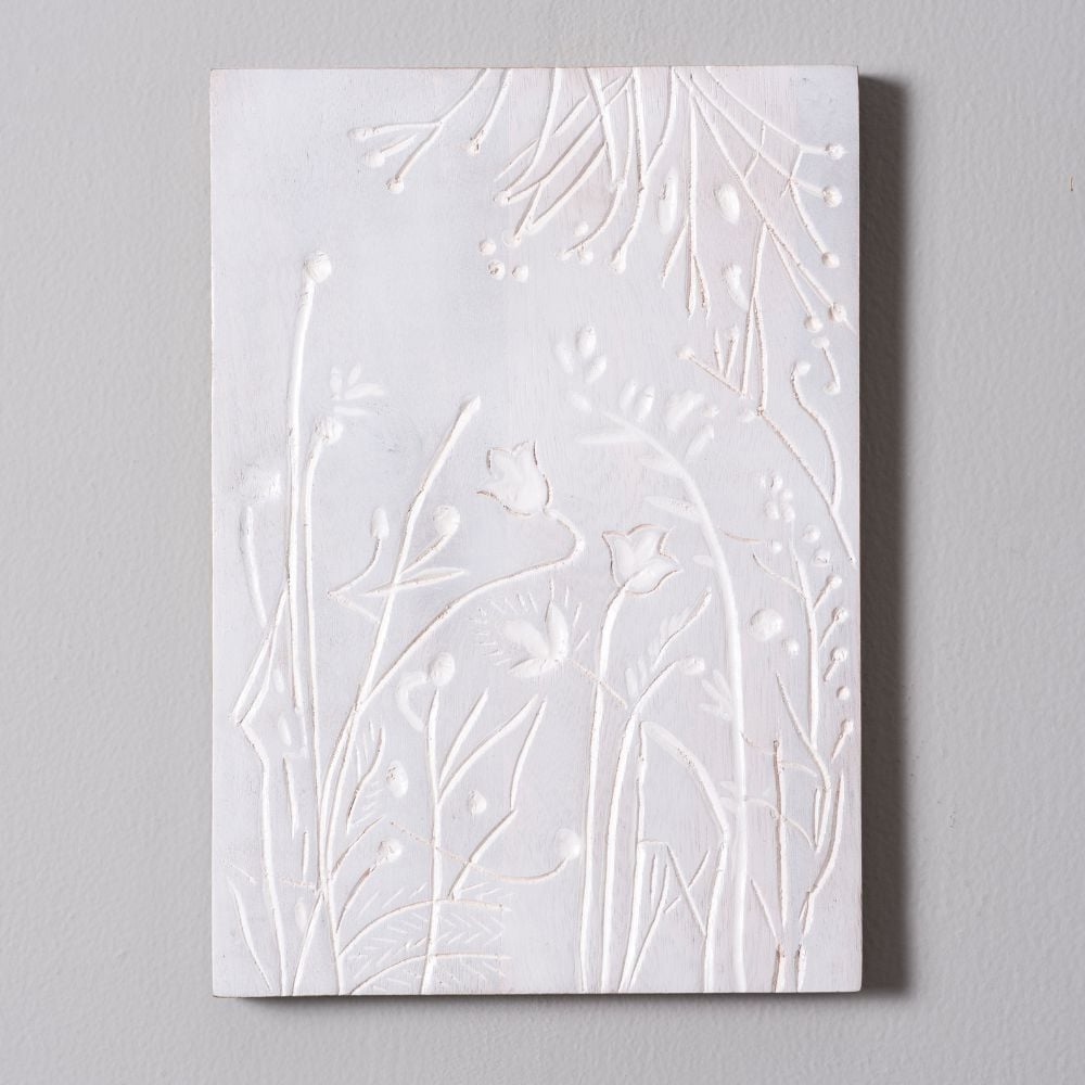 The all-white palette and detailed floral motif make this piece a versatile accent—perfect on its own or as part of a gallery wall.