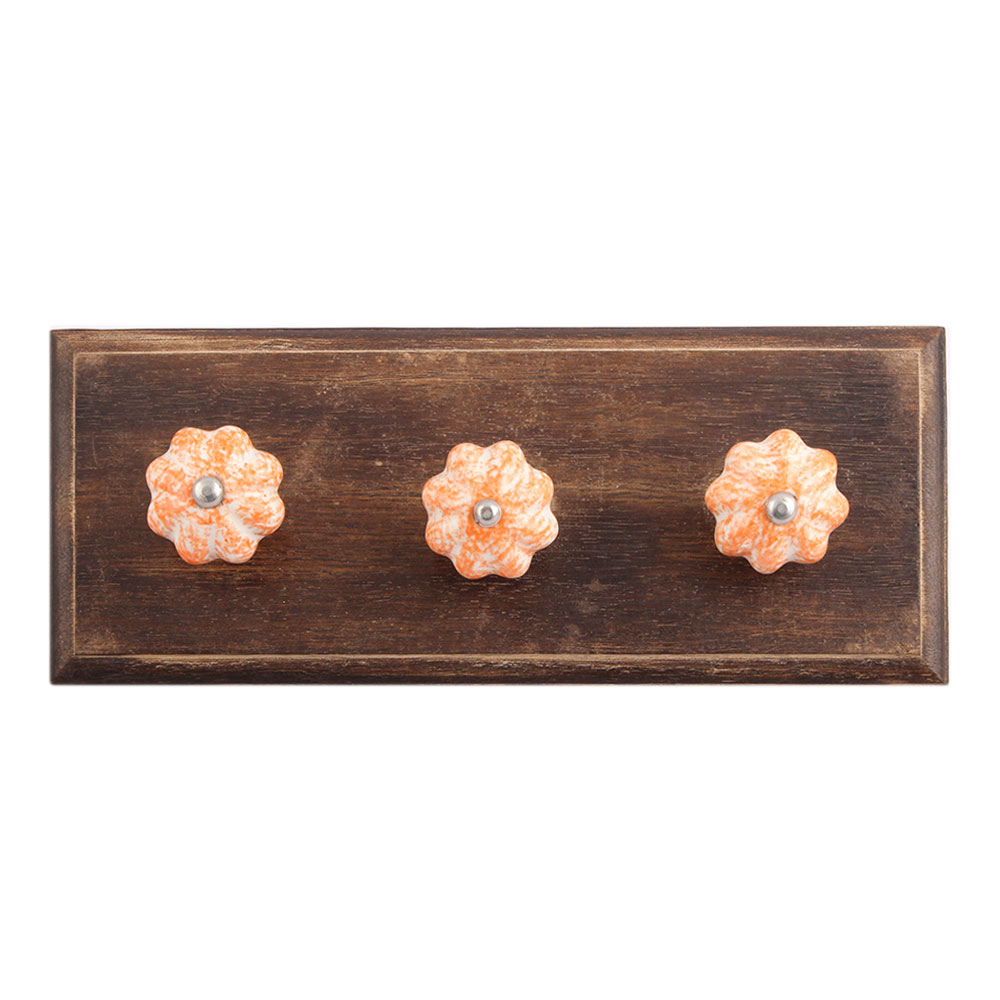 Sprinkled Orange Ceramic Wooden Hook. A Perfect Complement to the Soft Tone of the Wood are these White Traditional Hat & Coat Hook Made of Genuine Porcelain and Brass. It can be use to Hang Jewellery, Leashes, Towels, Scarves, Light Weight Sweaters, Caps Etc.
